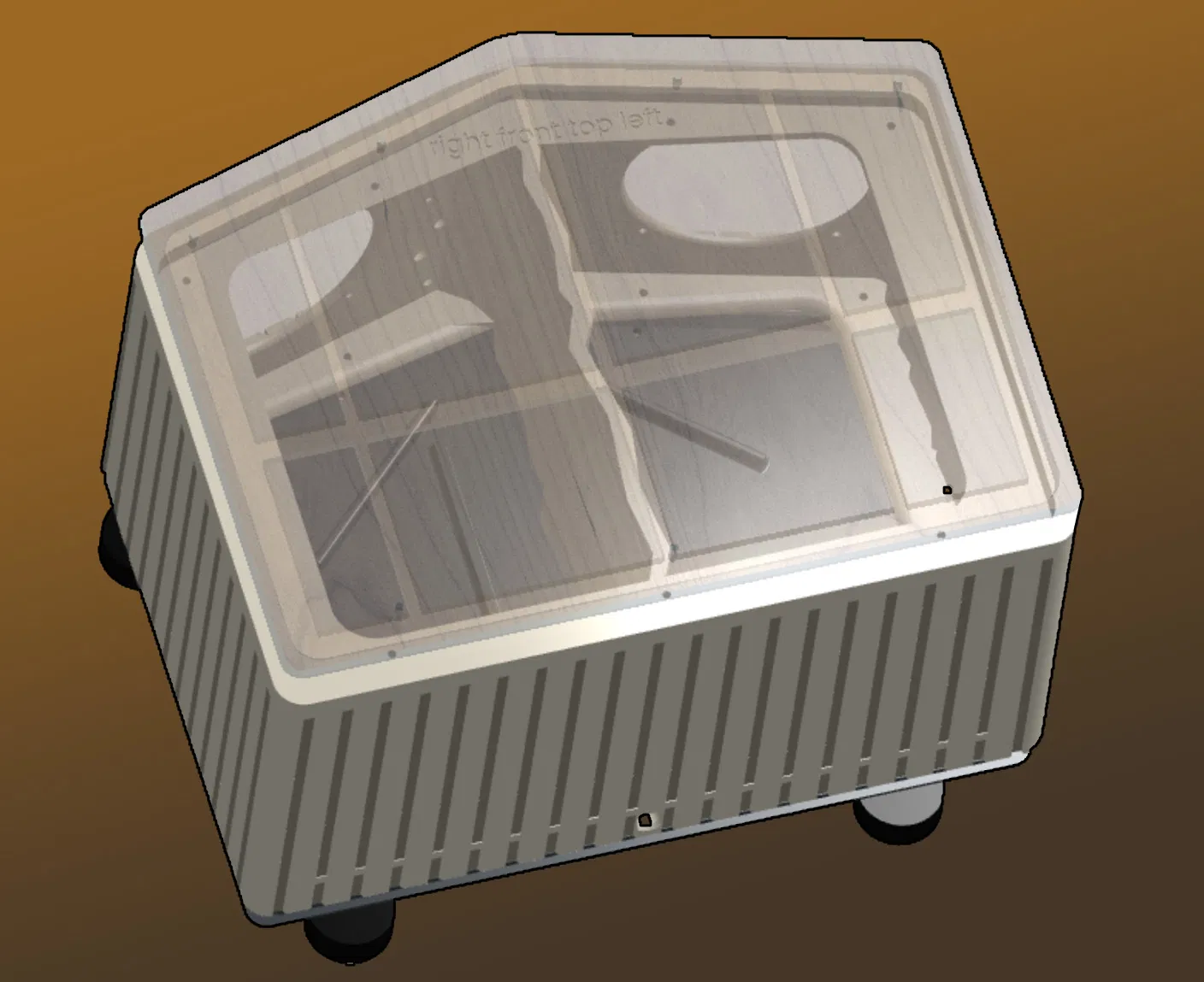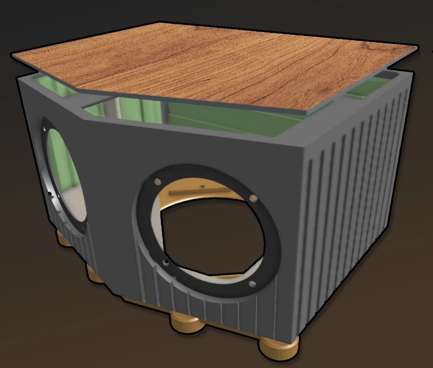 Đặc điểm chính của vỏ loa này là thiết kế thành dày 5mm cực kỳ cứng cáp (tôi dùng infill 20%). Các vách bên trong được gia cố bằng các đường gân/vách ngăn hình tam giác đặt ở các góc ngẫu nhiên giúp tán xạ âm thanh và triệt tiêu cộng hưởng.