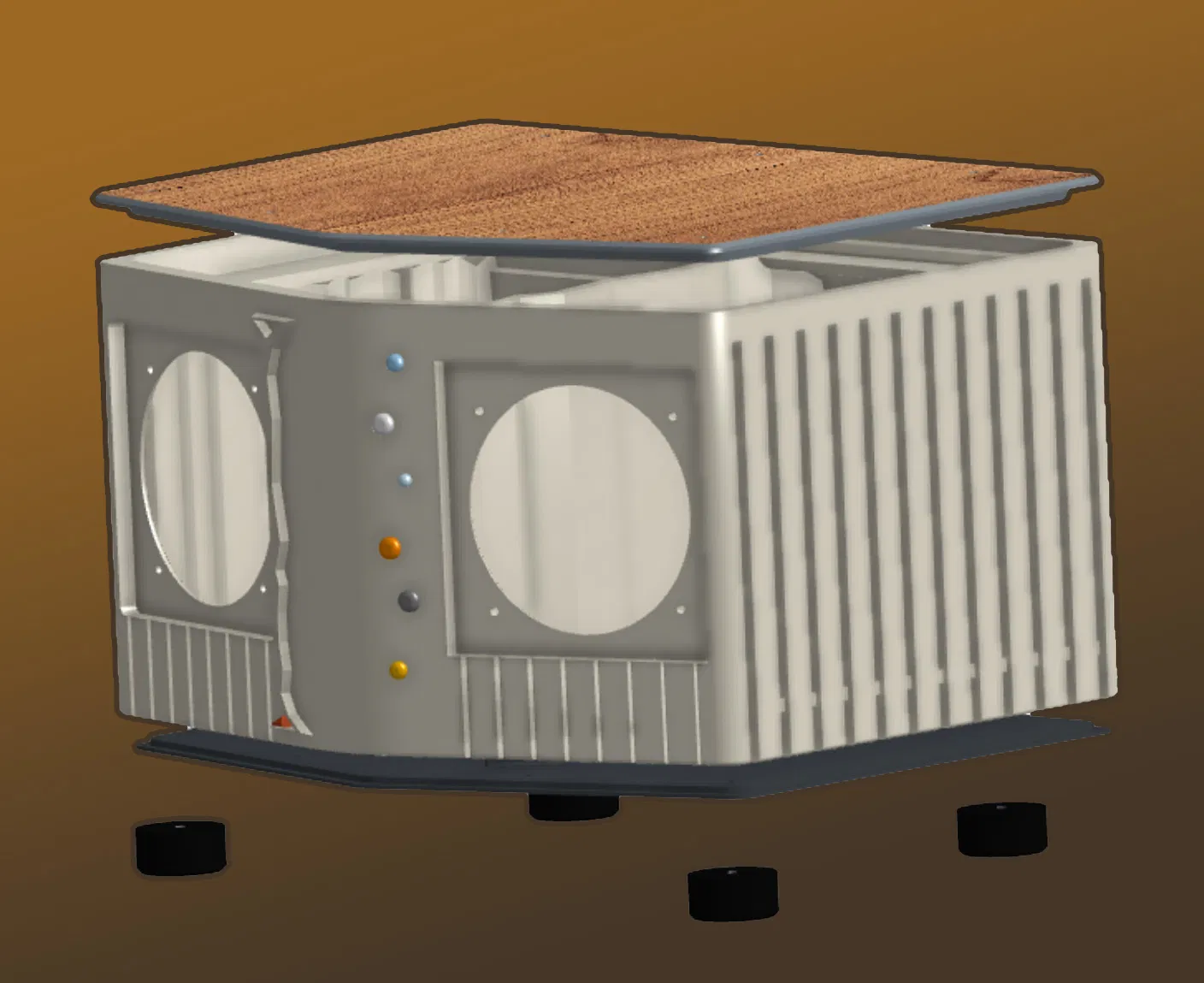 Thùng loa cần 2 củ loa 3" loại truncated (Dayton Audio RS75T-8) + một loa cộng hưởng thụ động (Passive Radiator) 4" để hỗ trợ âm trầm (Dayton Audio DMA105-PR).