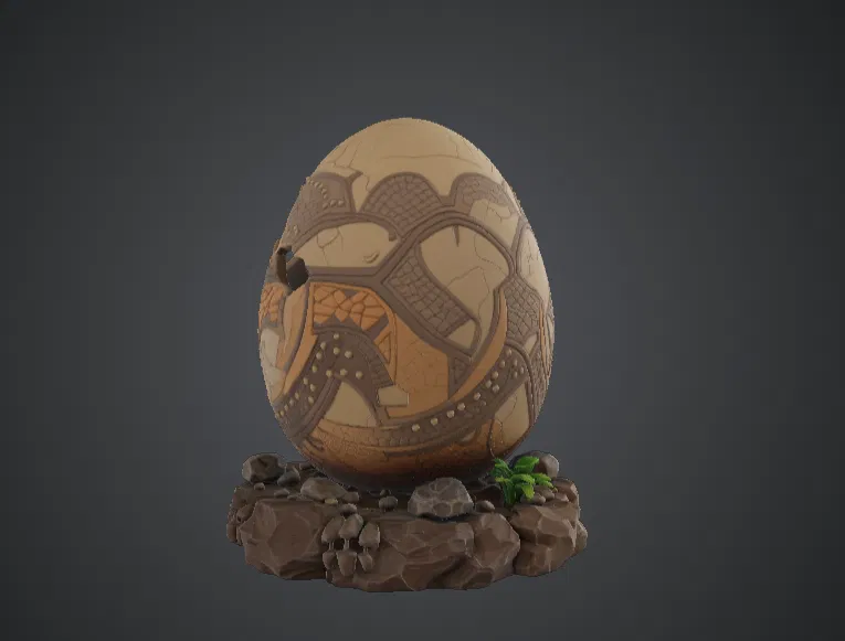 Mẫu Dragon Hatch Egg Diorama này tái hiện khoảnh khắc huyền ảo ngay trước khi một chú rồng con chào đời. Quả trứng lớn được chạm khắc những hoa văn giả tưởng tinh xảo, nằm trên một đế đá bao quanh bởi các tán cây và sỏi nhỏ. Một mặt của vỏ trứng đã nứt ra, để lộ không gian bên trong như thể chú rồng đang bắt đầu phá vỏ để chui ra ngoài. Những đường nét chi tiết trên vỏ trứng, kết hợp cùng đế đá tự nhiên và các chi tiết thực vật thu nhỏ, tạo nên một khung cảnh giả tưởng sống động đầy tính kể chuyện. Họa tiết rồng được chạm trổ trên vỏ trứng gợi nhắc về sinh vật đầy quyền năng đã từng nằm yên bên trong.