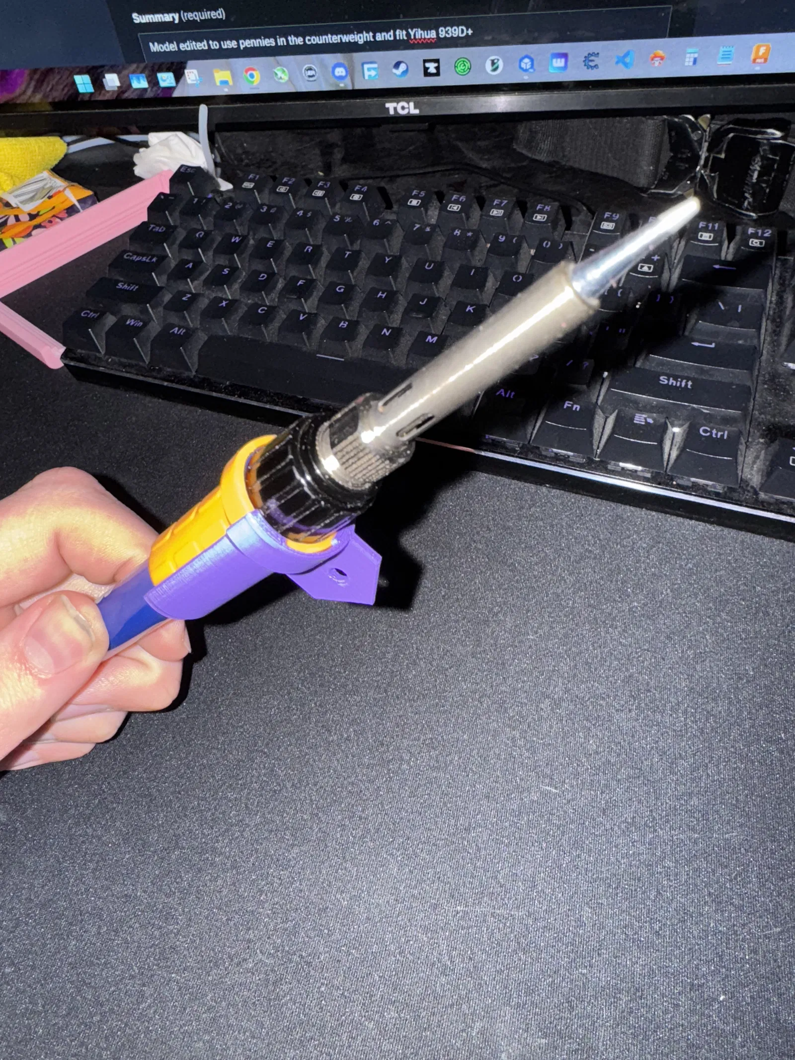 Đối với những ai làm việc thường xuyên với mỏ hàn, việc cầm nắm trong thời gian dài đôi khi gây mỏi tay hoặc mất cân bằng trọng tâm. Model này được thiết kế như một bộ đối trọng (counterweight) kiêm ngàm gắn chuyên dụng, tối ưu hóa cho tay hàn Yihua 907F. Điểm độc đáo của phiên bản này là phần đối trọng được thiết kế để nhét vừa các đồng xu, giúp bạn dễ dàng tùy chỉnh trọng lượng sao cho cân bằng nhất với thói quen cầm tay của riêng mình.