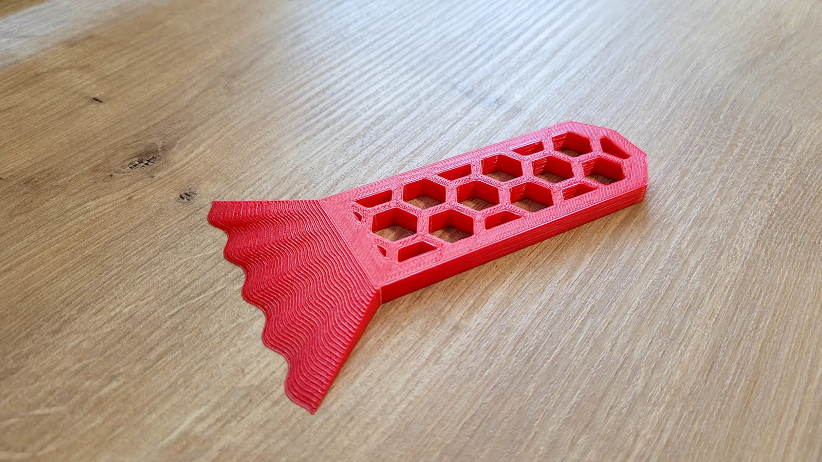 Bạn đang gặp khó khăn khi lấy mô hình 3D hoặc phần gờ ra khỏi bàn in? Một chiếc dao cạo (scraper) với lưỡi dao lượn sóng sẽ giúp công việc này trở nên dễ dàng hơn nhiều. Thiết kế này giúp lưỡi dao chỉ tiếp xúc với bản in tại một vài điểm thay vì toàn bộ bề mặt phẳng, nhờ đó việc tách lớp nhựa filament trở nên nhẹ nhàng và thuận tiện hơn.