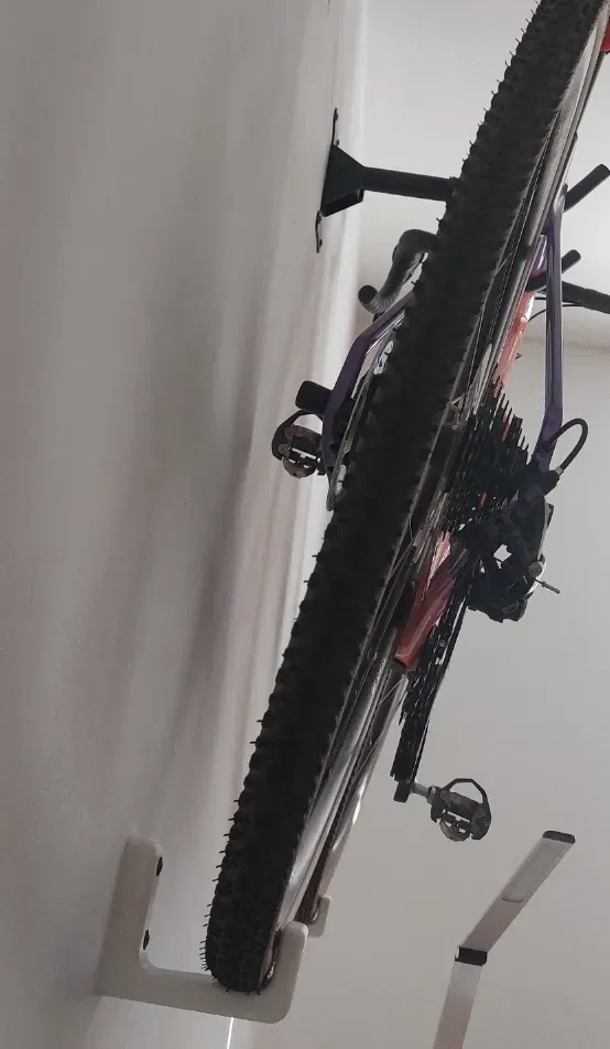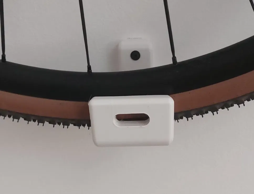 Khi chiếc xe đạp treo trên tường, có một khoảng trống lớn giữa các bánh xe và tường. Để tiết kiệm không gian dưới chiếc xe đạp, tôi có 2 móc để kéo các bánh xe lại gần tường hơn. Cái “thứ ở giữa” đó có nhiệm vụ ngăn chặn sự xoay của bánh trước.