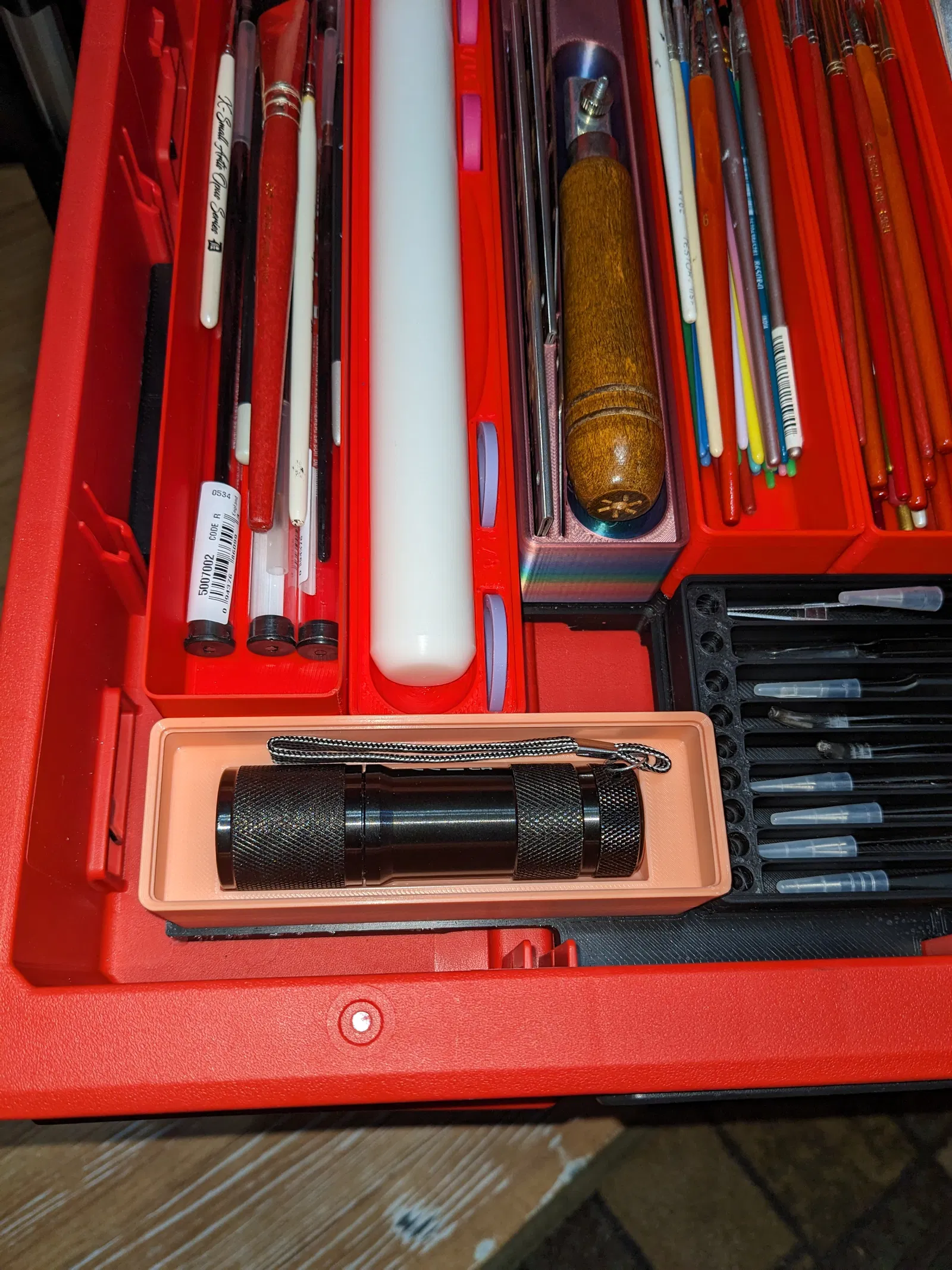 Lúc đầu mình chỉ dùng mấy cái khay mua ở cửa hàng đồng giá để đựng đồ trong PACKOUT, nhưng cách này không tối ưu không gian chút nào. Gần đây, mình đã bắt đầu chuyển sang dùng Gridfinity để sắp xếp lại các ngăn kéo, giúp không gian gọn gàng và khoa học hơn hẳn.