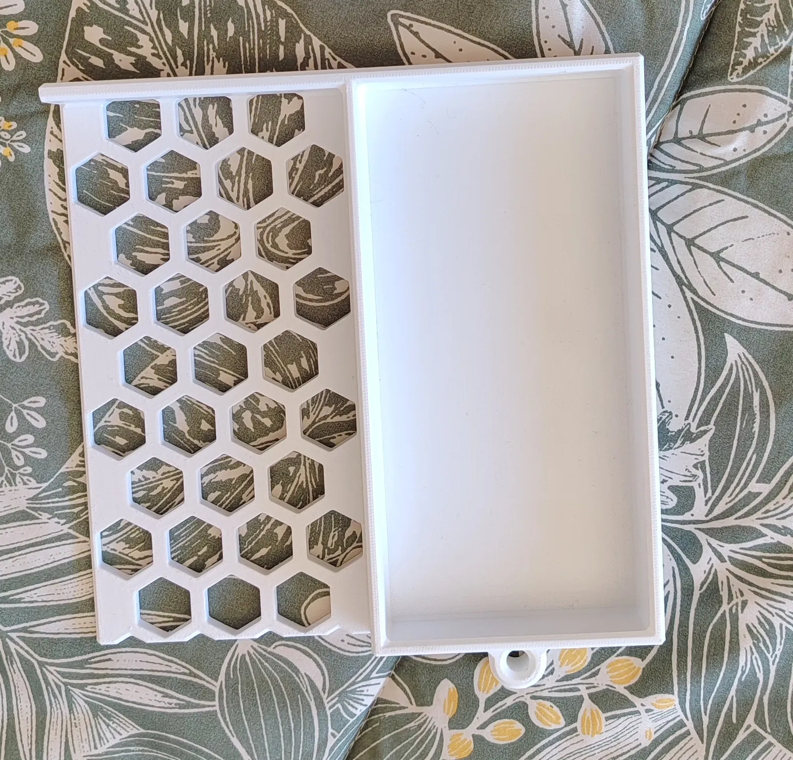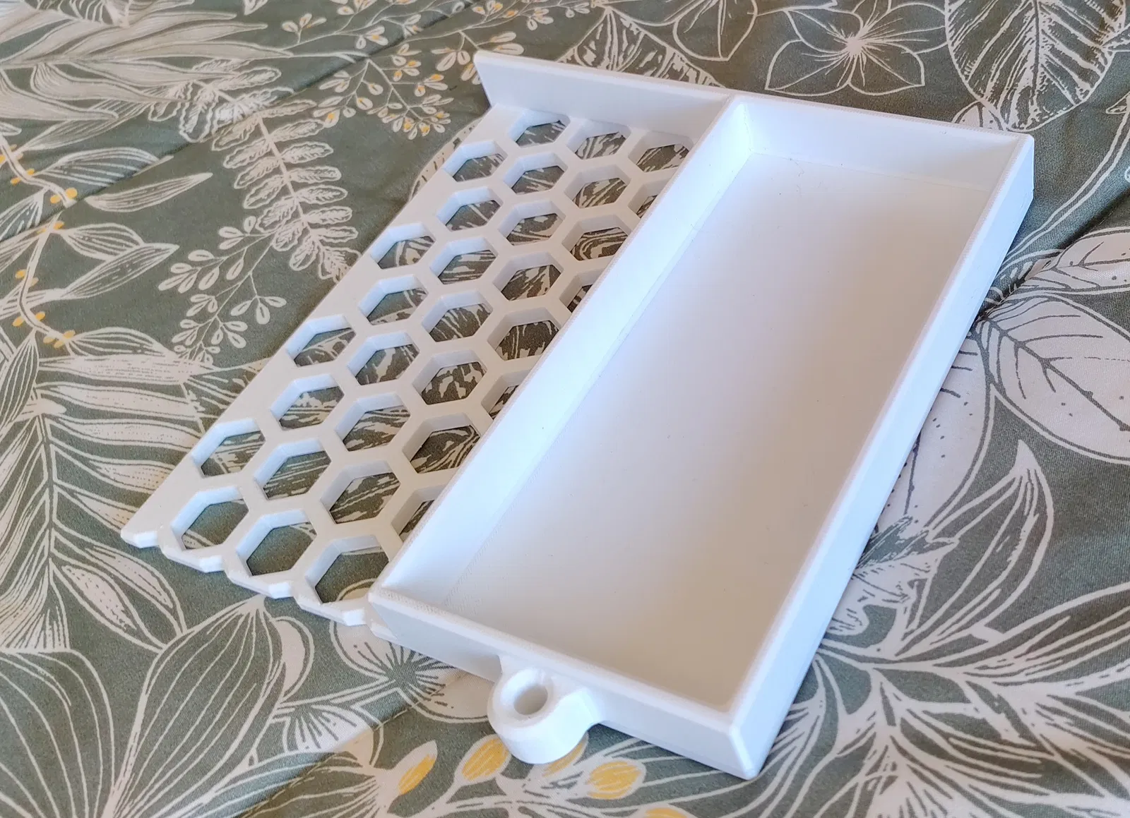 - Khay kết hợp: Một nửa khay phẳng để đựng điện thoại/đồng hồ và một nửa là lưới dạng tổ ong (honeycomb).