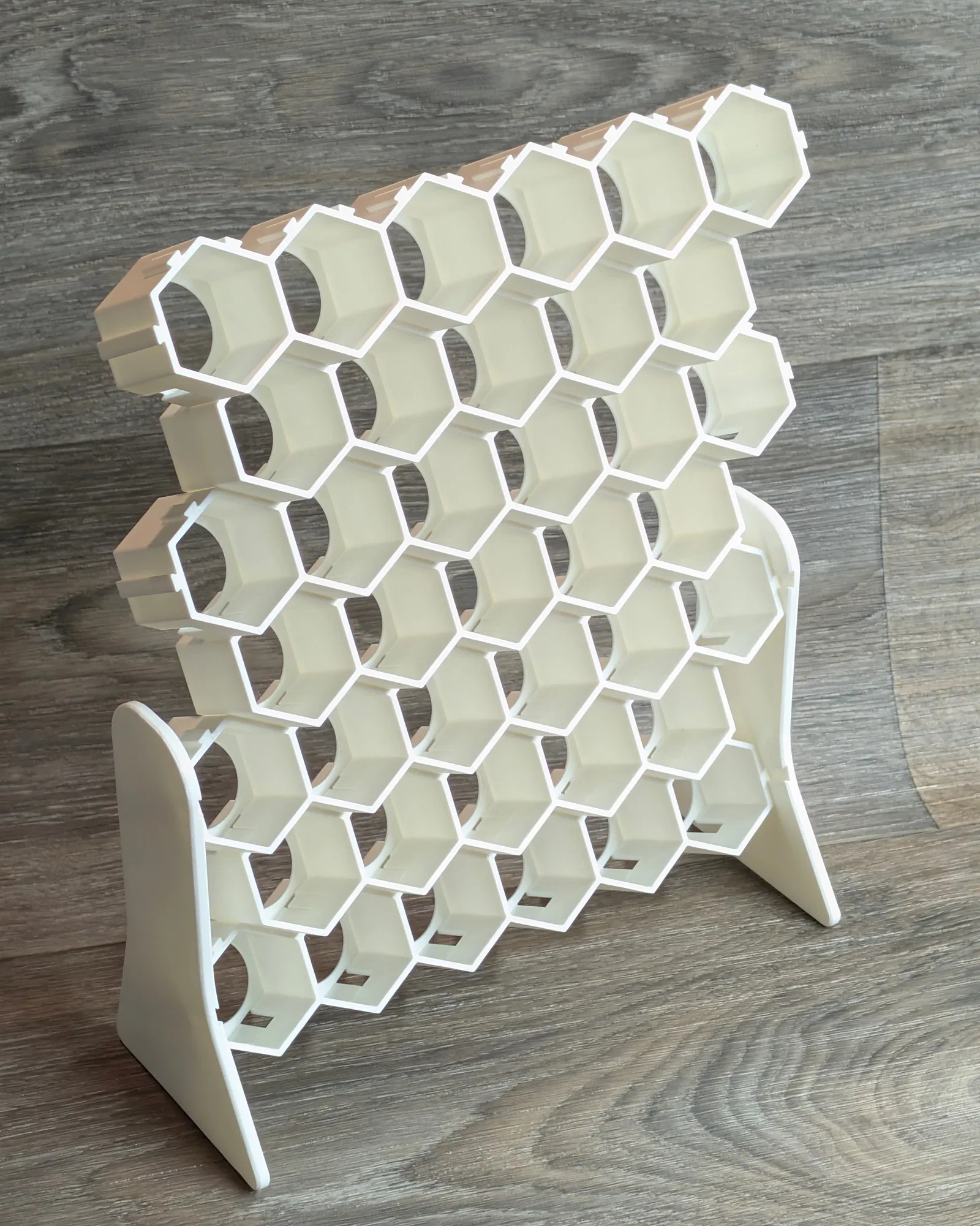 Đây là giải pháp kệ lưu trữ dạng modular có thể tùy chỉnh, thiết kế chuyên dụng cho các chai sơn acrylic dung tích 2oz (60ml). Sản phẩm hỗ trợ nhiều kiểu sắp xếp như treo tường, để đứng hoặc đặt nghiêng trên bàn vô cùng tiện lợi.