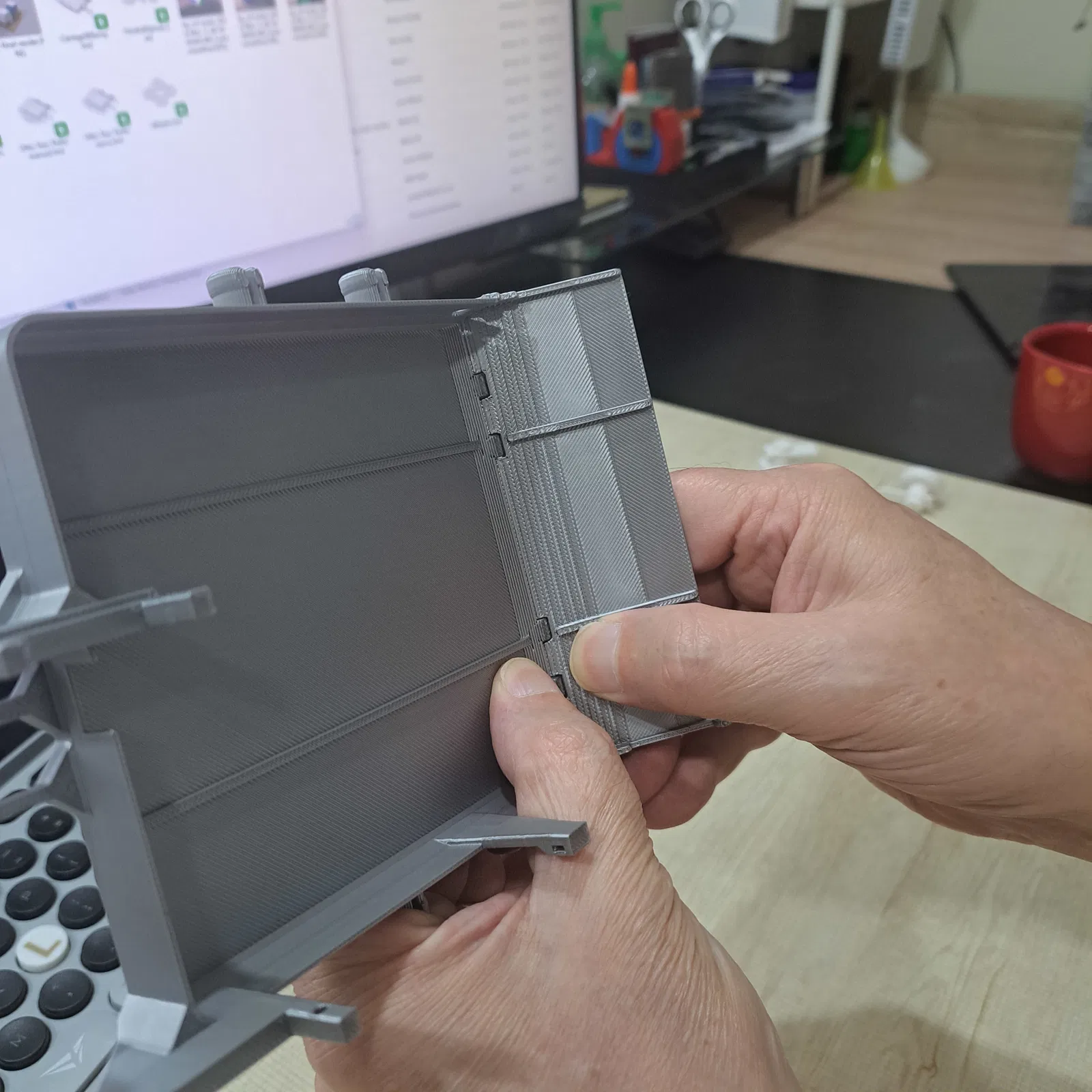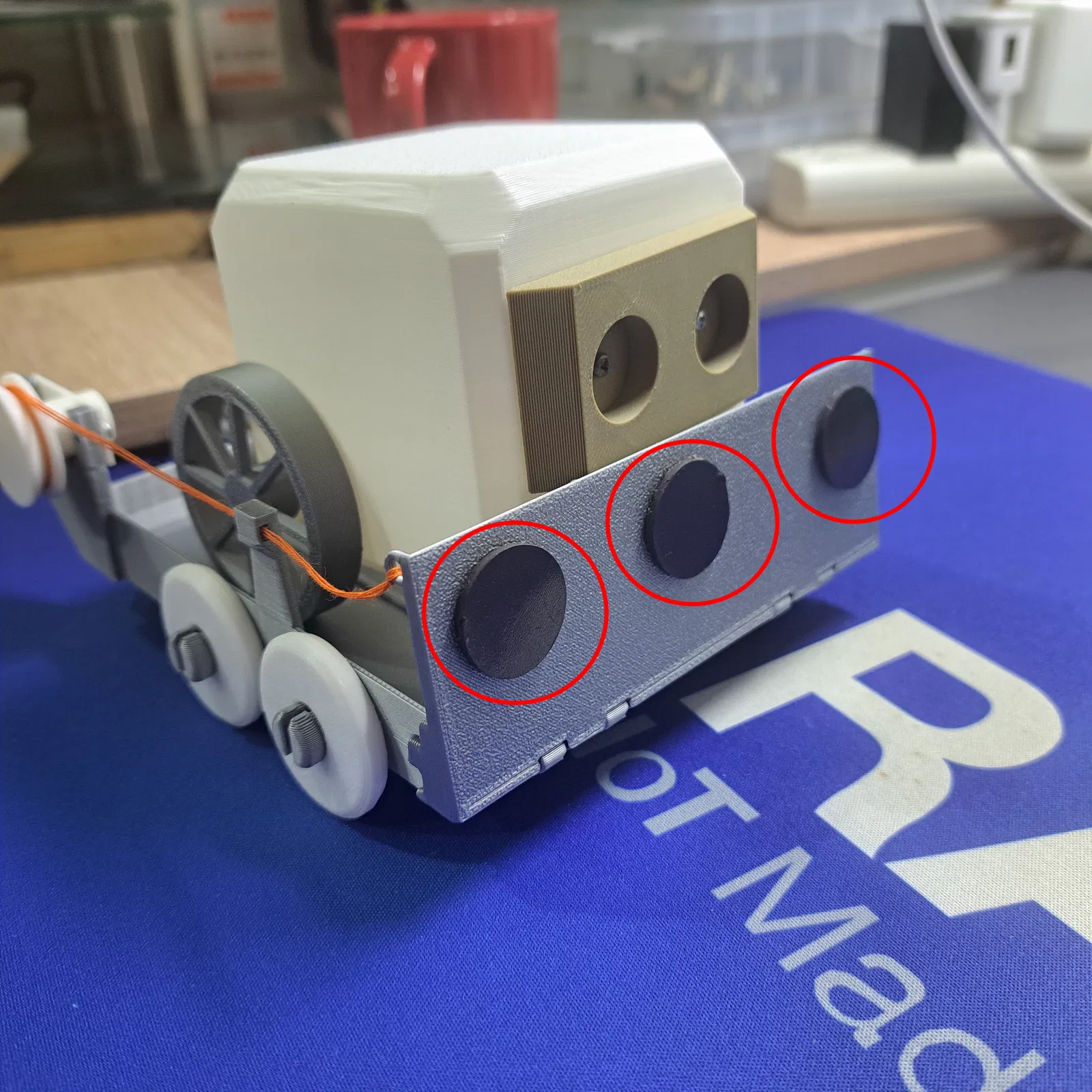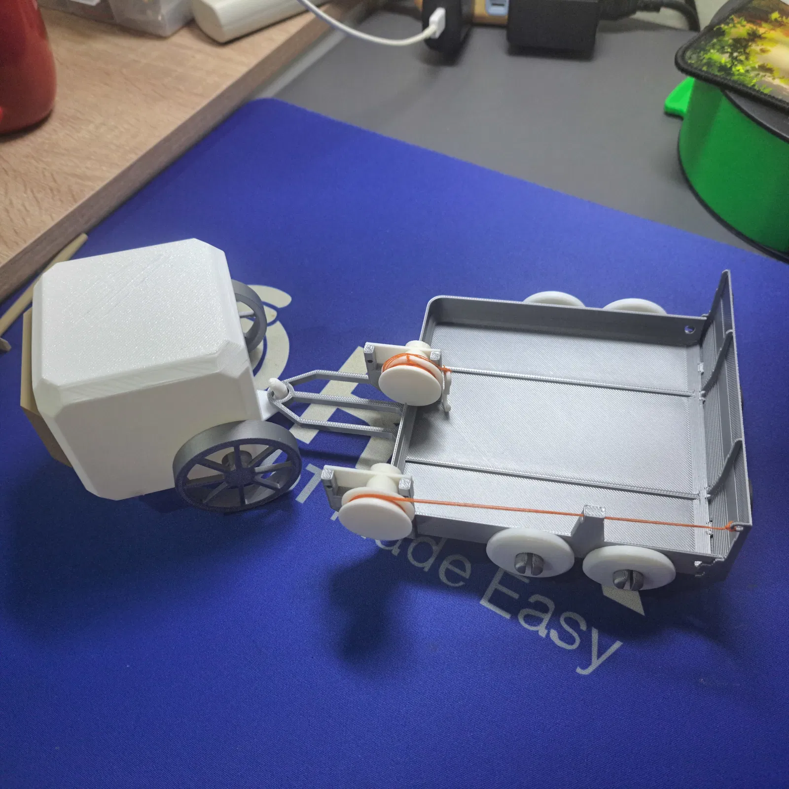 Xe moóc và cầu dẫn được in theo phương pháp in tại chỗ (print-in-place). Sau khi in xong, hãy để các chi tiết nguội hẳn trước khi gỡ khỏi bàn in.