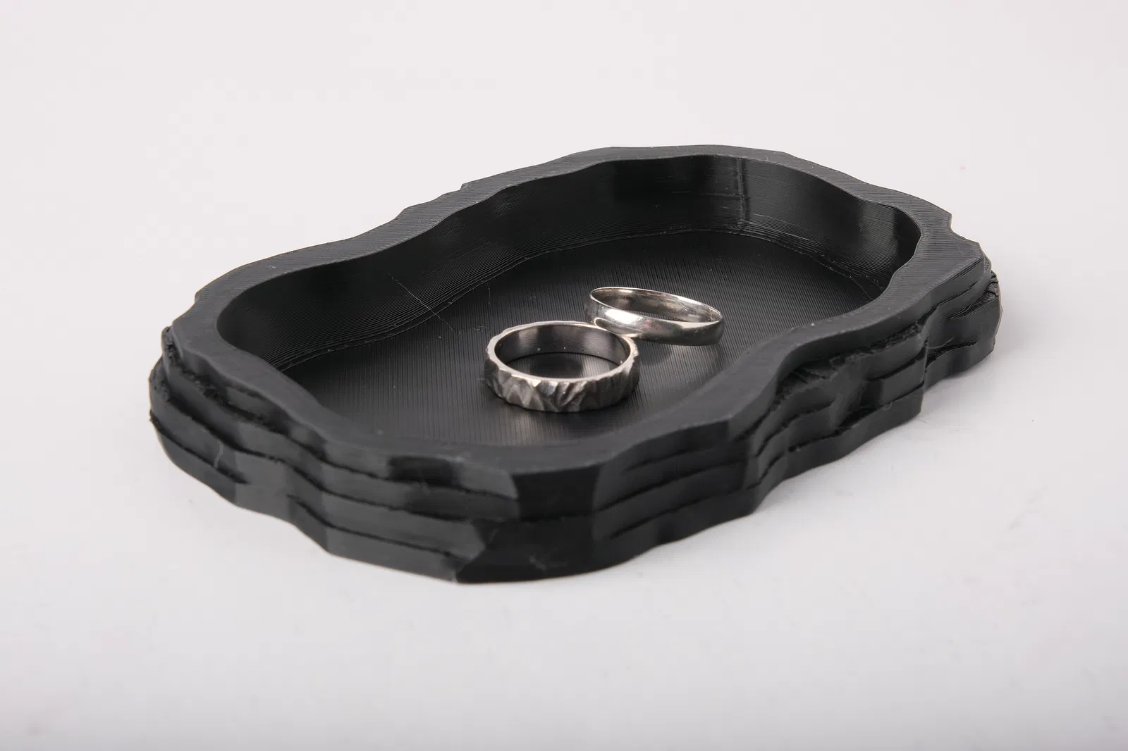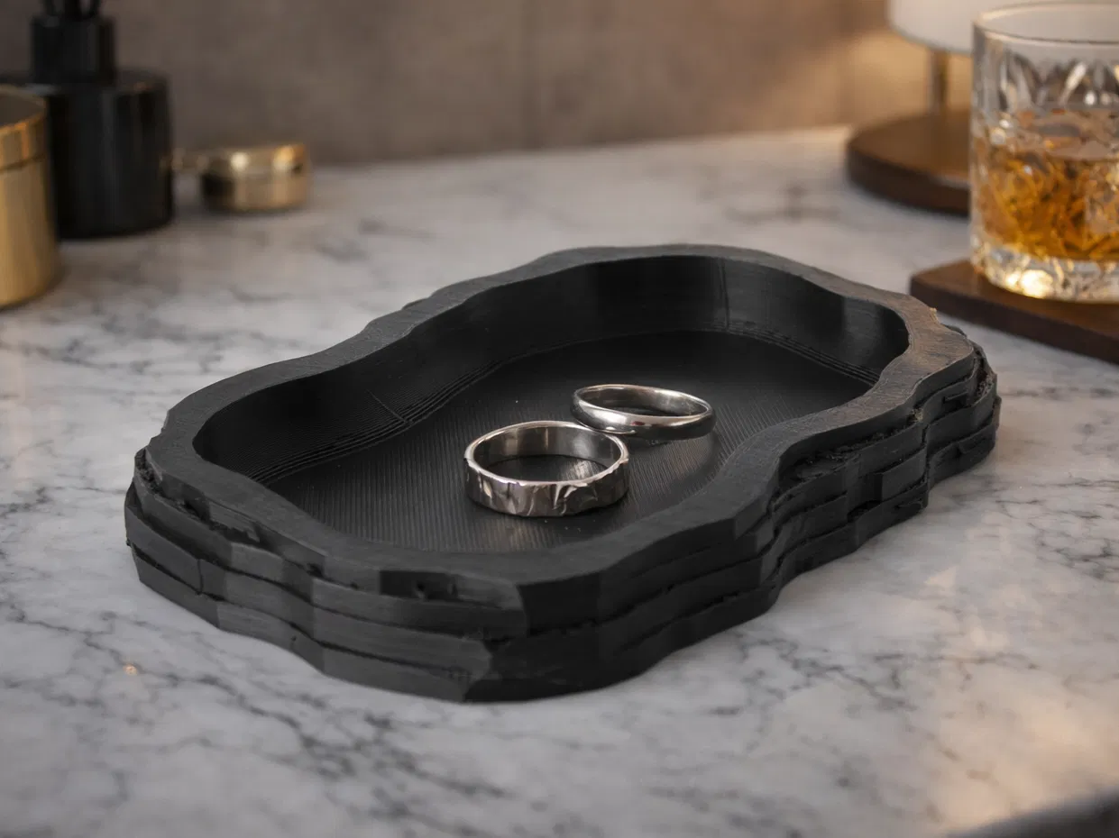 Chiếc khay in 3D với thiết kế lấy cảm hứng từ các lớp đá tự nhiên, hoàn hảo để đựng trang sức, chìa khóa hay các vật dụng nhỏ. Với bề mặt đen nhám và phong cách tối giản, đây là món đồ trang trí tinh tế cho không gian sống của bạn.
