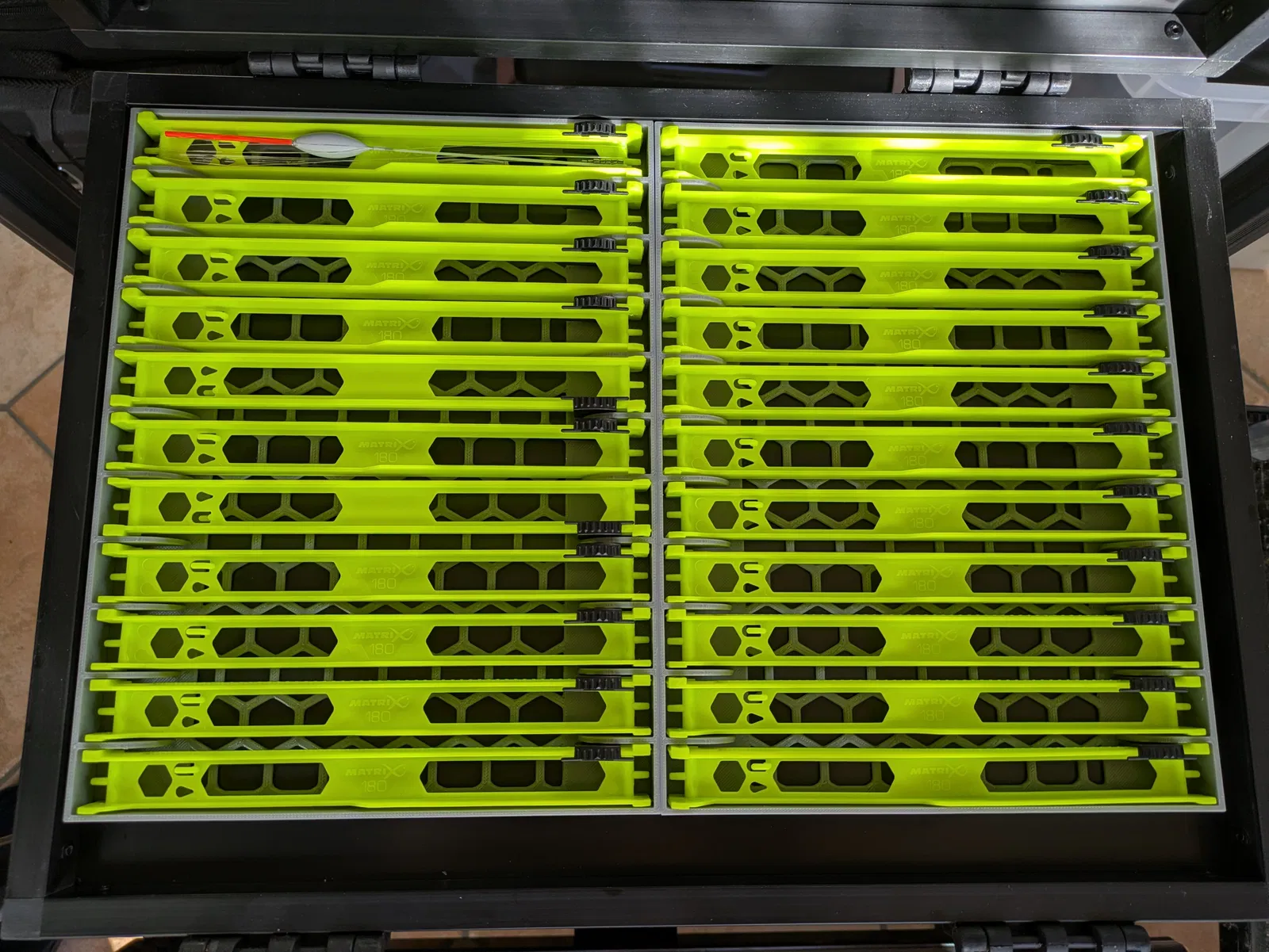 Những chiếc khay này giúp bạn cất giữ gọn gàng các bộ dây câu đã được quấn sẵn vào trục trong thùng ngồi câu cá của mình. Ban đầu, mình thiết kế các khay này để đựng trục quấn dây Matrix 180mm cho thùng ngồi Nytro SLS36, mỗi khay chứa được 11 trục. Bạn có thể đặt 2 khay cạnh nhau ngay bên dưới nắp thùng ngồi. Các kích thước hiện có: | Loại trục quấn | Kích thước trục tối đa | Số lượng | Kích thước khay | | :--- | :--- | :--- | :--- | | Matrix 180mm | 20mm x 180mm | 11 | Rộng: 244mm, Dài: 186mm, Cao: 16mm |