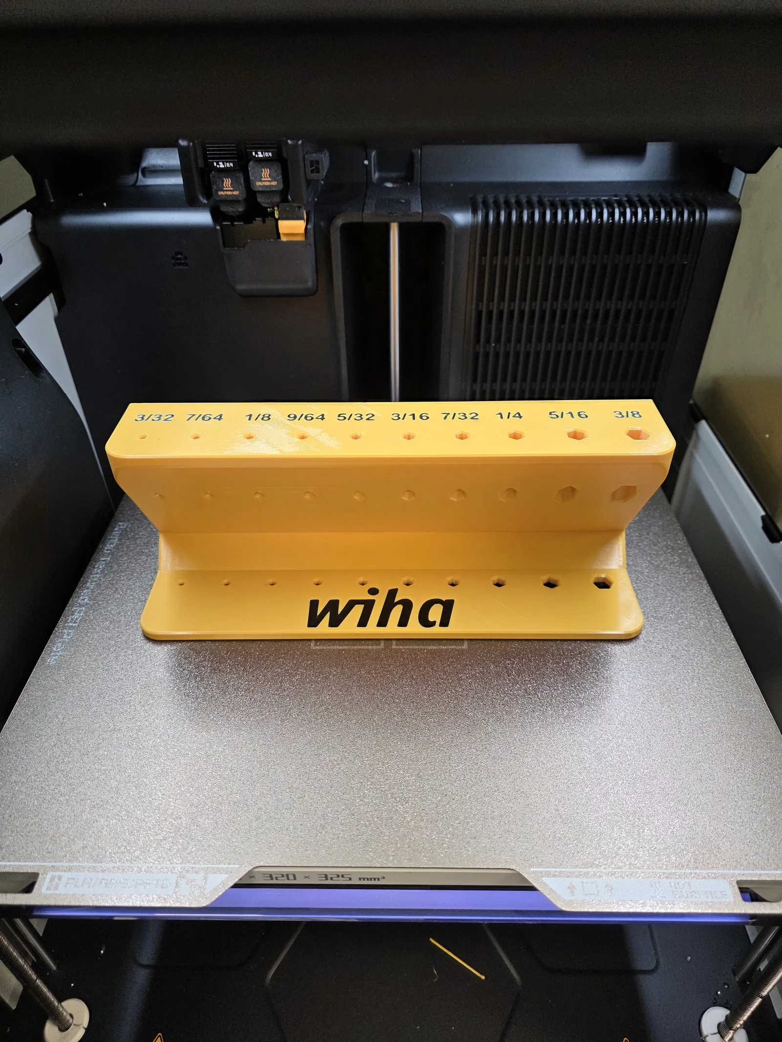 Mình vừa mới thiết kế xong cái đế này để cất bộ lục giác T-handle hệ Imperial của Wiha. Đế có tích hợp thêm một ngăn chứa đồ ở phía sau rất tiện. Phần thân và phần chữ/logo được tách riêng ra nên anh em có thể in phối hai màu thoải mái. Mình đã in thử bằng máy H2D với nhựa ABS đen và vàng, kết quả rất ưng ý.