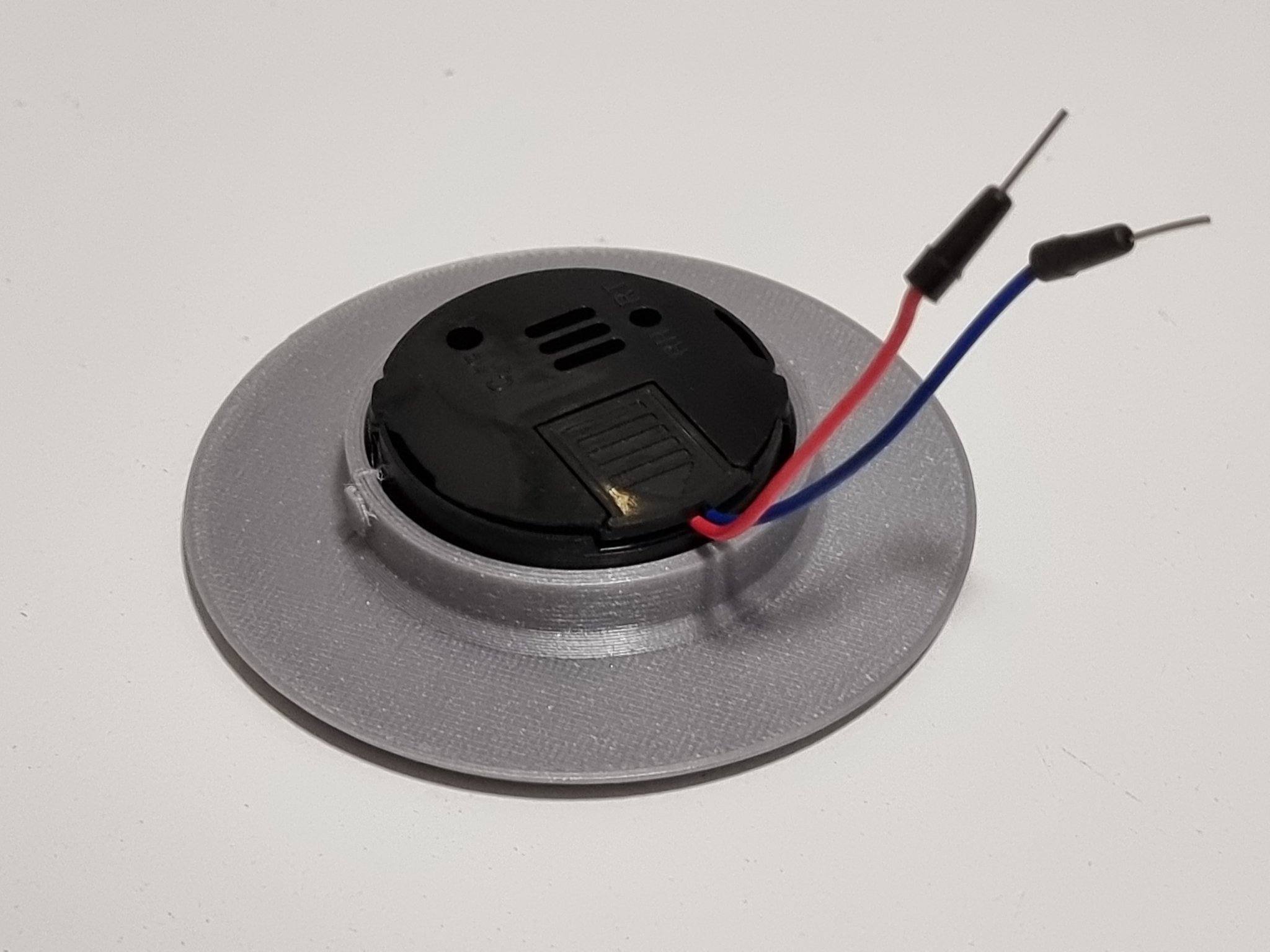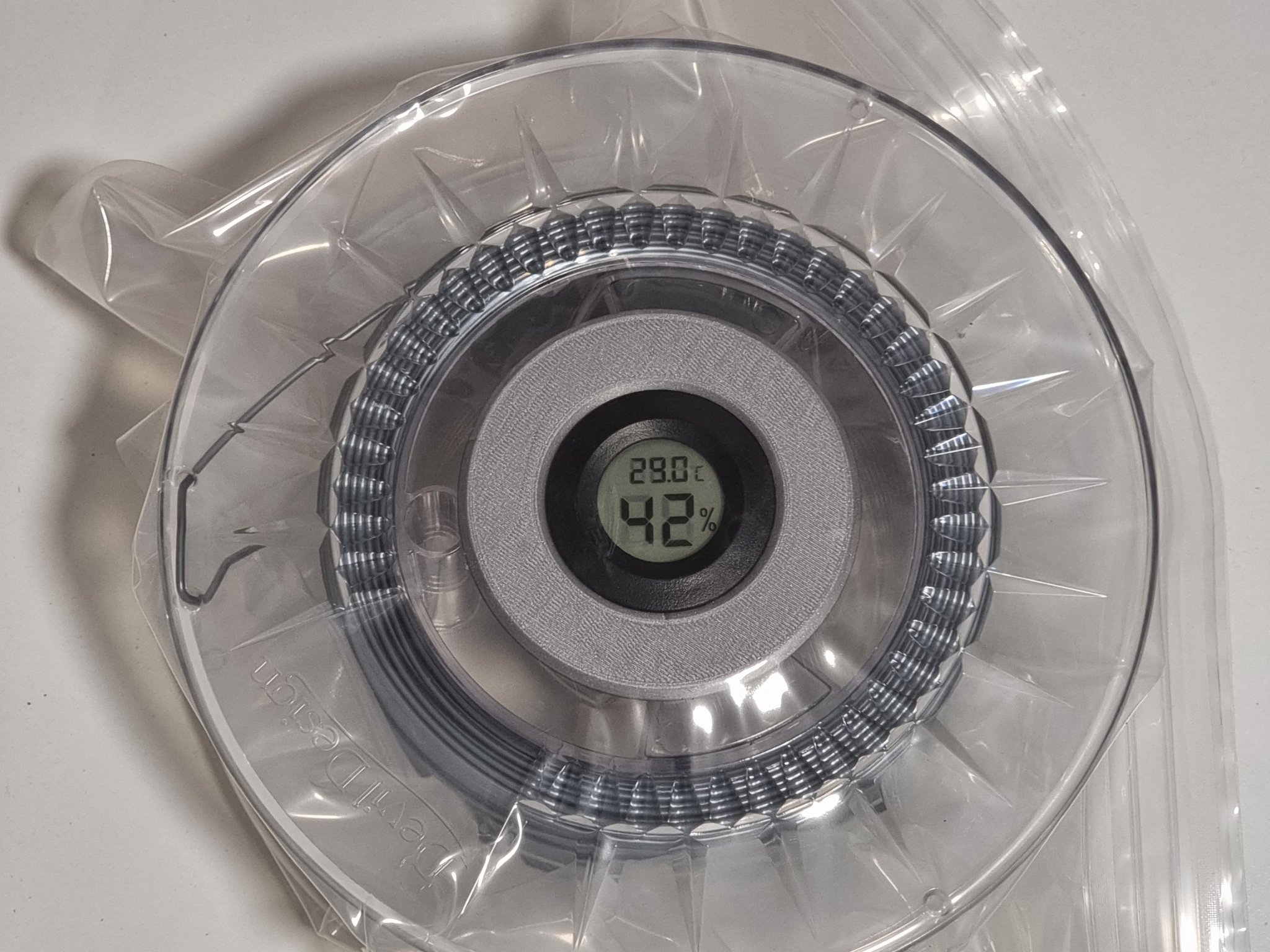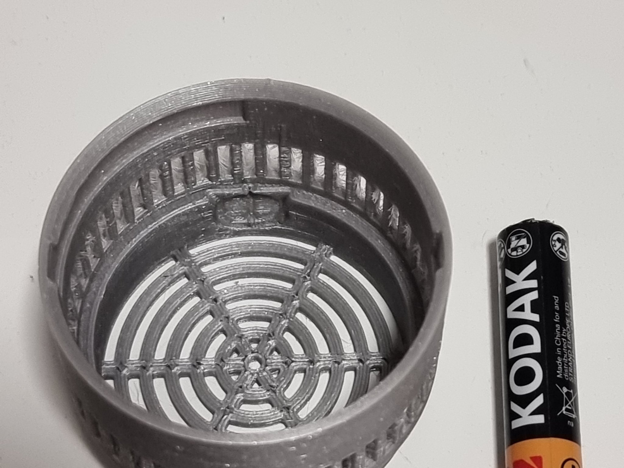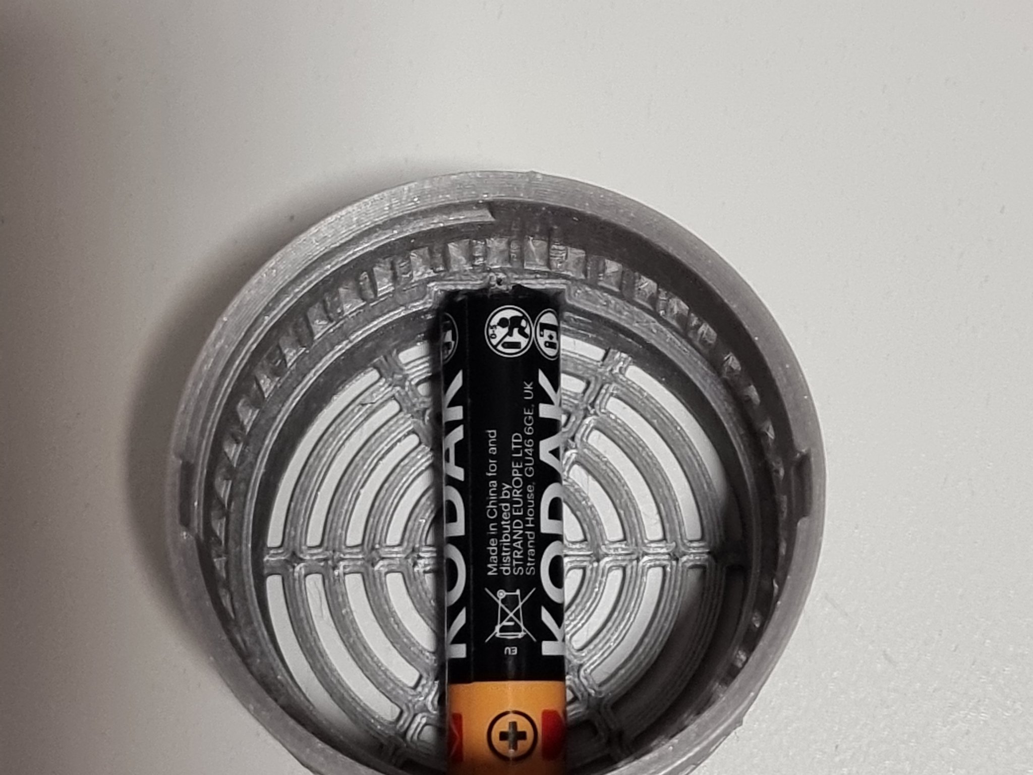 Đây là một bản remix của một container kích thước cuộn filament desiccant/silica mô-đun tuyệt vời bởi @TinkrMakr. Tôi rất thích ý tưởng kiểm soát độ ẩm trong các túi hút chân không bằng gel silica và máy đo độ ẩm như (https://www.amazon.com/dp/B07GR67G1M/ref=cm_sw_em_r_mt_dp_vZo7FbC9323KF?_encoding=UTF8&psc=1). Bởi vì chúng đo nhiệt độ và mức độ ẩm mỗi 10 giây, tôi thấy rằng pin trong những thiết bị đó hết khá nhanh. Tôi đã cải tiến một chút mô-đun máy đo độ ẩm để phù hợp với pin AAA nhằm khắc phục vấn đề này. Thực tế là LR44 chỉ có 115 mAh trong khi AAA có 1100 mAh sẽ cải thiện tuổi thọ pin của máy đo độ ẩm gấp 9,5 lần. Tôi giữ thiết kế của tất cả các mô-đun để có thể thay thế với các bộ phận gốc. Nếu bạn thích ý tưởng và chỉ muốn cải thiện tuổi thọ pin của máy đo độ ẩm, bạn có thể in và thay thế chỉ container máy đo độ ẩm/pin. Tôi cũng đã thêm lỗ trong hình nón container silica để tăng cường lưu thông không khí. Bạn có thể phải mở rộng lỗ cho cực dương của pin. Tôi đã sử dụng một cây ghim may và một chiếc bật lửa để làm nóng nó. Sau đó, chân kết nối nên dễ dàng nhảy vào giá đỡ. Do kích thước của pin/kích thước của container, phần kết nối âm chỉ được in với một rãnh cho chân (không có lỗ) mặc dù nó tồn tại trong thiết kế. Nhưng tôi không gặp vấn đề với điều này vì kích thước của cực âm của pin AAA. Tôi đã sử dụng các kết nối/cáp chân breadboard. Cắt chúng làm đôi và hàn chúng vào các kết nối pin bên trong máy đo độ ẩm. Quy trình này hoàn toàn có thể đảo ngược nếu bạn tháo rời máy đo độ ẩm trước và hàn dây cẩn thận. Hãy nhớ rằng cực âm của pin nút LR44 có một cực âm ở giữa - trong khi các pin khác thường có một cực dương. Bạn có thể phải cắt một chút xung quanh giá đỡ pin trong khoang pin để phù hợp với các dây cáp và đóng nắp pin. Xem các bức ảnh để biết hướng dẫn lắp đặt và chi tiết. Để chia sẻ điều tốt đẹp và tăng cường sự sáng tạo của cộng đồng, tôi đã bao gồm tệp bước nếu bạn muốn thực hiện các chỉnh sửa của riêng mình. ### Hướng dẫn in Không cần hỗ trợ. Do thiết kế của các lỗ, việc dây cáp có thể sẽ rõ ràng. Nó không ảnh hưởng đáng kể đến khả năng sử dụng của giá đỡ. Nếu bạn thấy nó quá cao so với sở thích của mình, hãy thử giảm nhiệt độ của vòi phun xuống 5-10 độ Celsius.