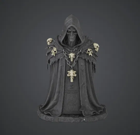 Mô hình Necromancer Skull Priest đầy uy nghiêm với bộ áo choàng và di vật xương, khắc họa chân thực bậc thầy ma thuật cái chết với những chi tiết huyền bí, phù hợp cho người đam mê in 3D phong cách dark fantasy.