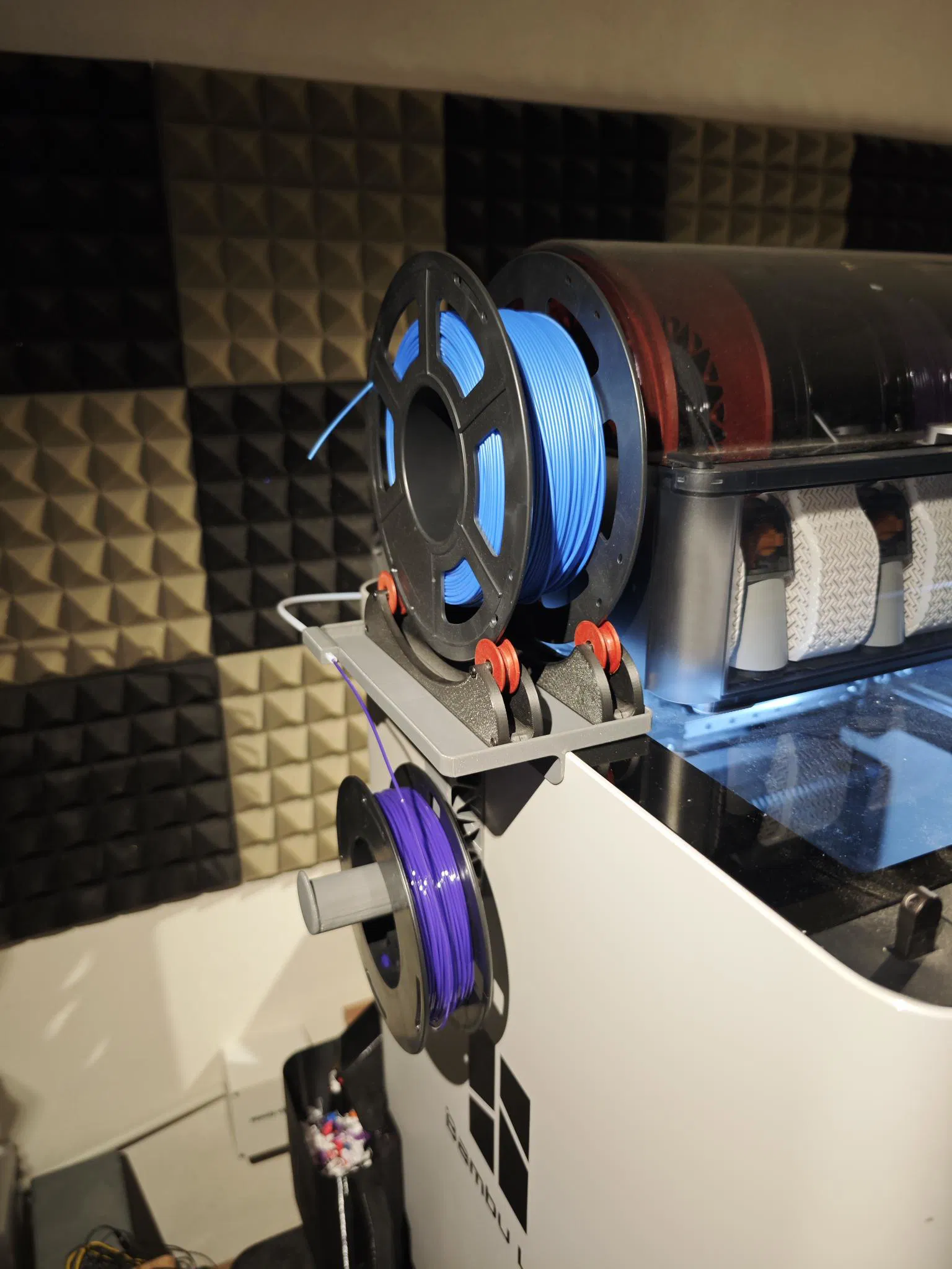 Mình vừa làm một cái giá đỡ cuộn filament cho máy in H2S và H2D. Nếu anh em nào không thích cái giá đỡ zin từ Bambu Lab thì có thể thử mẫu này nhé. Thiết kế này linh hoạt, anh em có thể đặt cuộn filament lên hoặc treo hẳn sang bên hông máy in đều được.