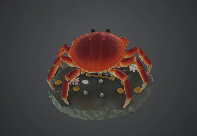 Chú Treasure Guardian Crab này là một sinh vật biển đầy thú vị, đang canh giữ chiếc rương chứa đầy kho báu bị thất lạc. Với dáng vẻ oai vệ trên đỉnh rương, bao quanh là những đồng tiền vàng, vỏ sò và san hô vương vãi, chú cua trông như đã sẵn sàng bảo vệ kho báu dưới đáy biển trước bất kỳ kẻ săn tìm nào. Những chi tiết tỉ mỉ ở bộ càng, kết cấu vỏ độc đáo và tư thế sống động mang lại cho nhân vật này sự duyên dáng và đầy cá tính.