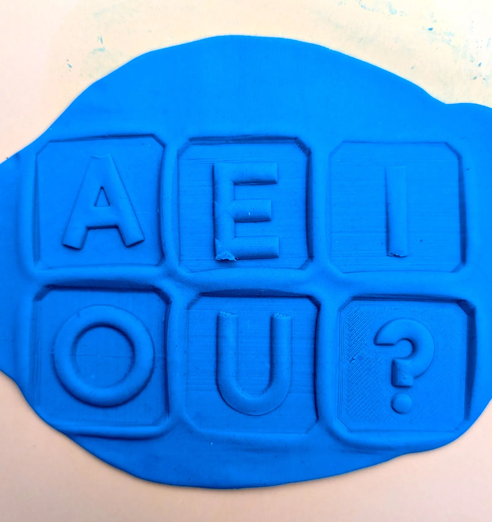 Mỗi mặt của khối lập phương này đều được khắc một trong các nguyên âm thông dụng (a, e, i, o, u), được thiết kế bằng phần mềm BlocksCAD.