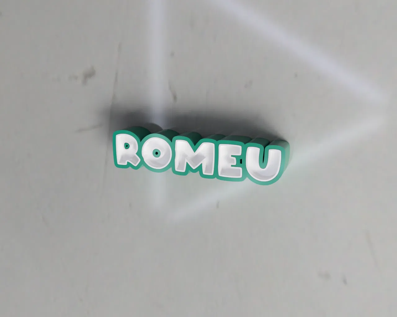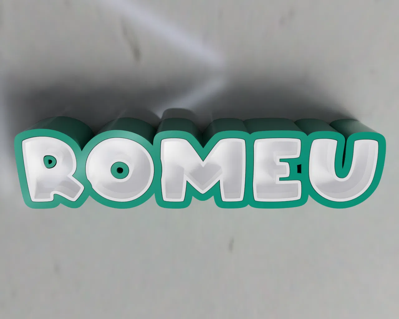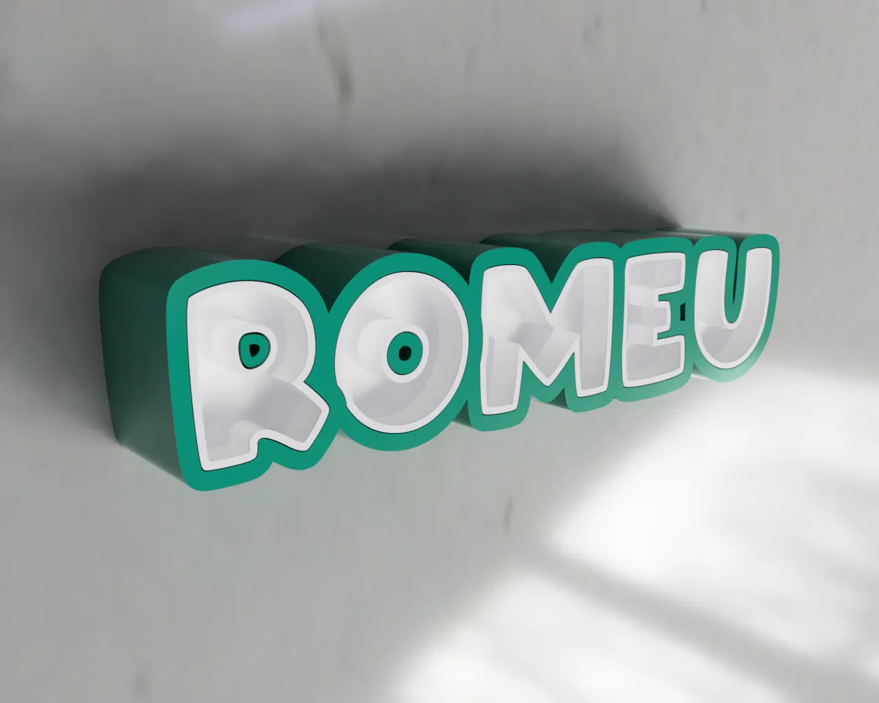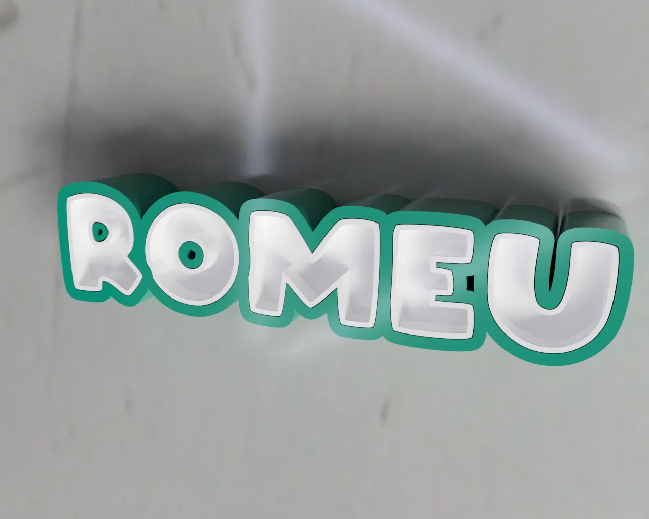 Mô hình bảng tên 3D "Romeu" với thiết kế phông chữ bo tròn, đậm nét, rất phù hợp để trang trí bàn làm việc hoặc phòng ngủ. Sản phẩm dễ in, không cần hỗ trợ (support) và là món quà cá nhân hóa tuyệt vời cho người thân yêu.