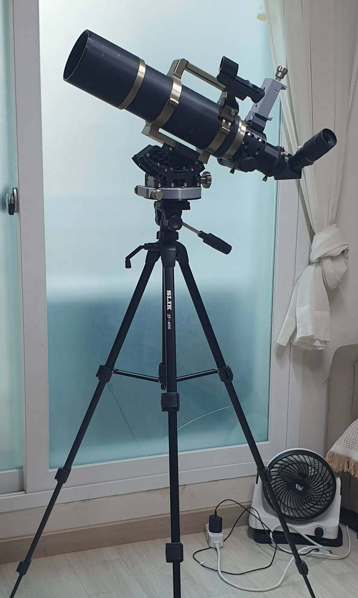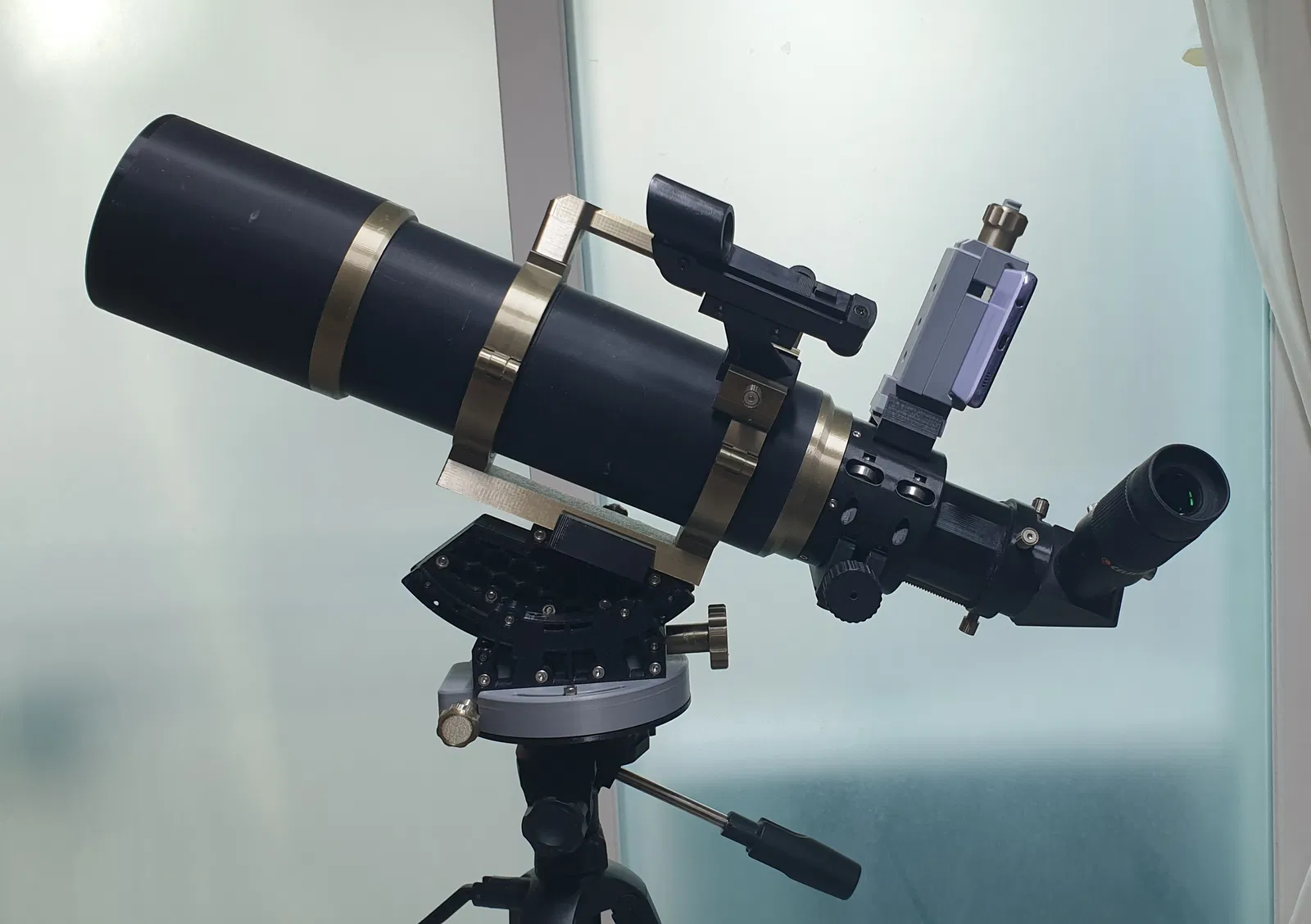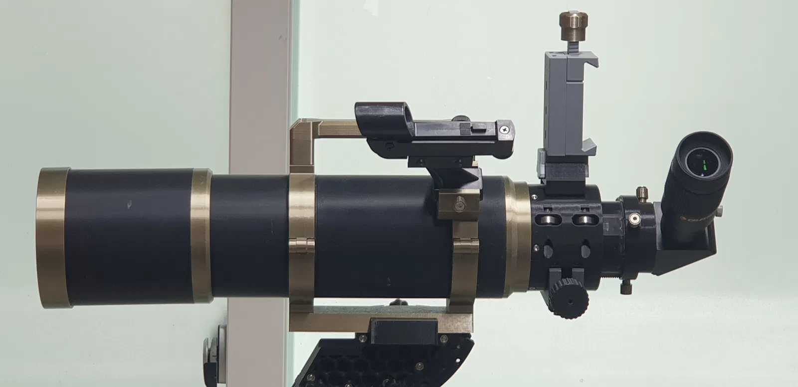 Kính thiên văn khúc xạ cầm tay (thấu kính: 80mm F500). Bao gồm giá đỡ (cradle) và bộ lấy nét (focuser).