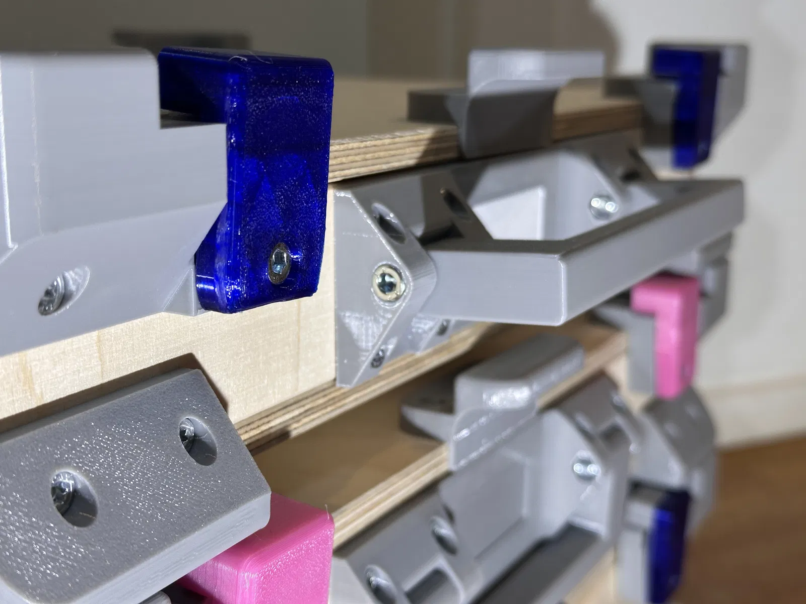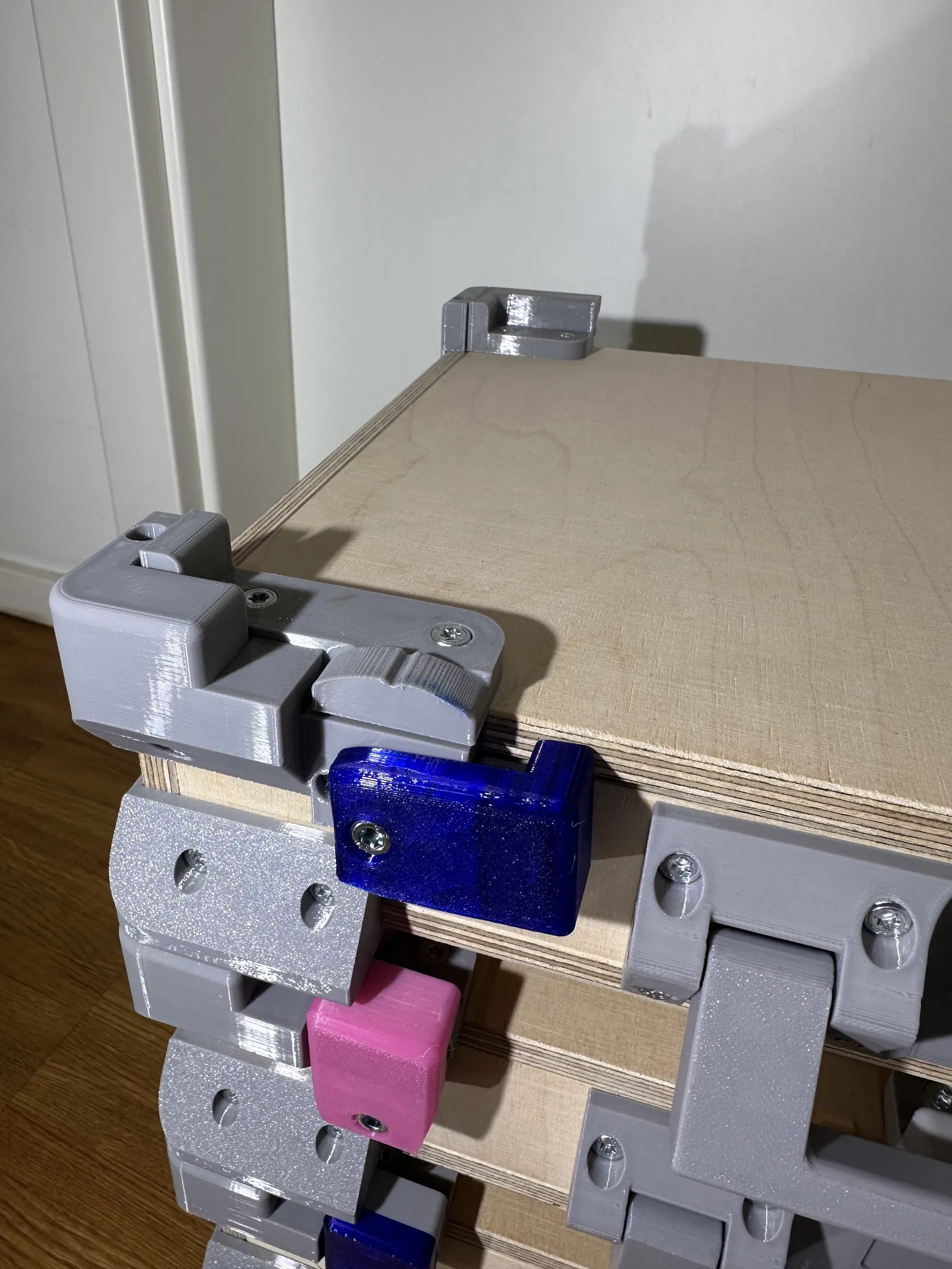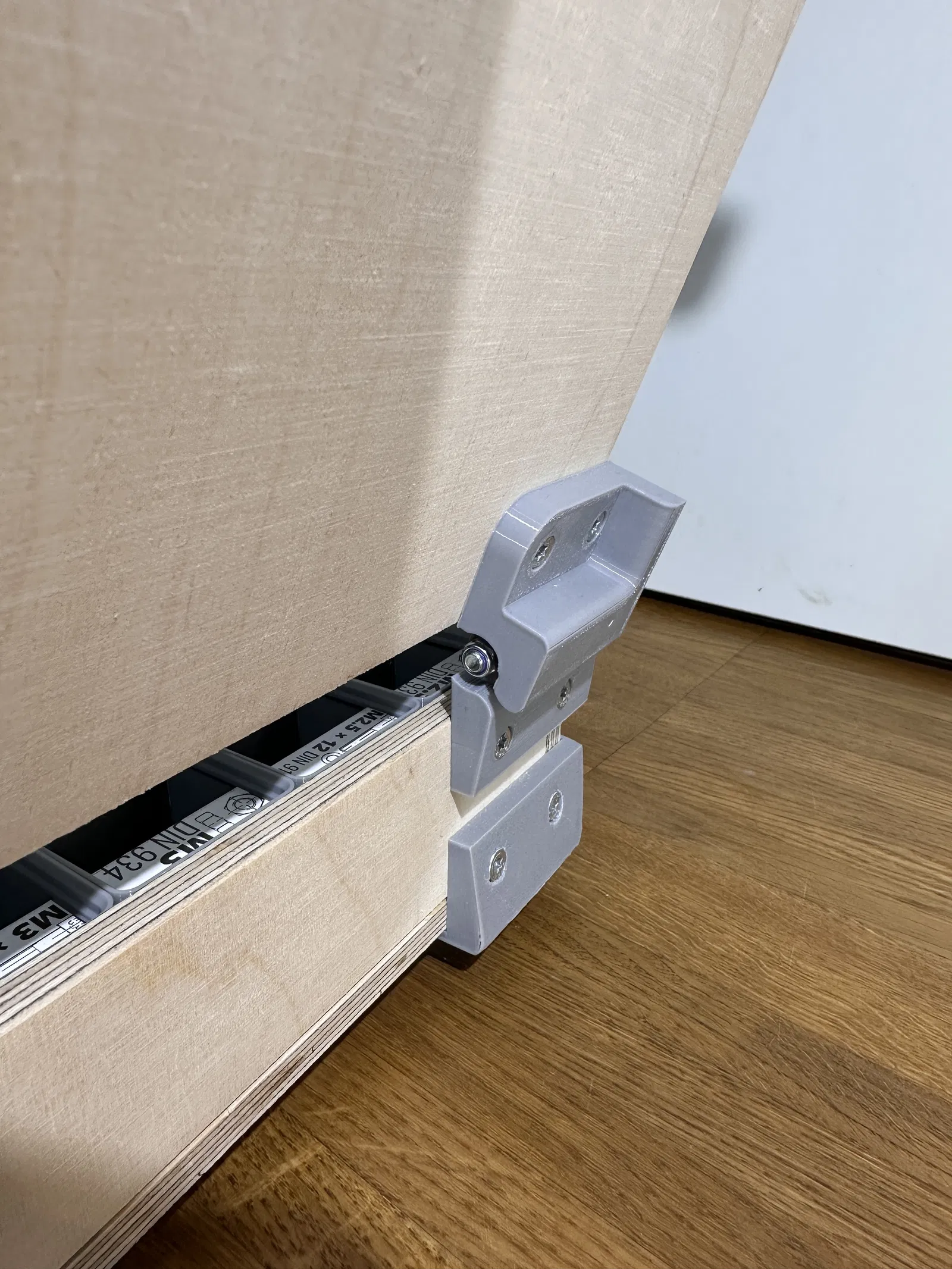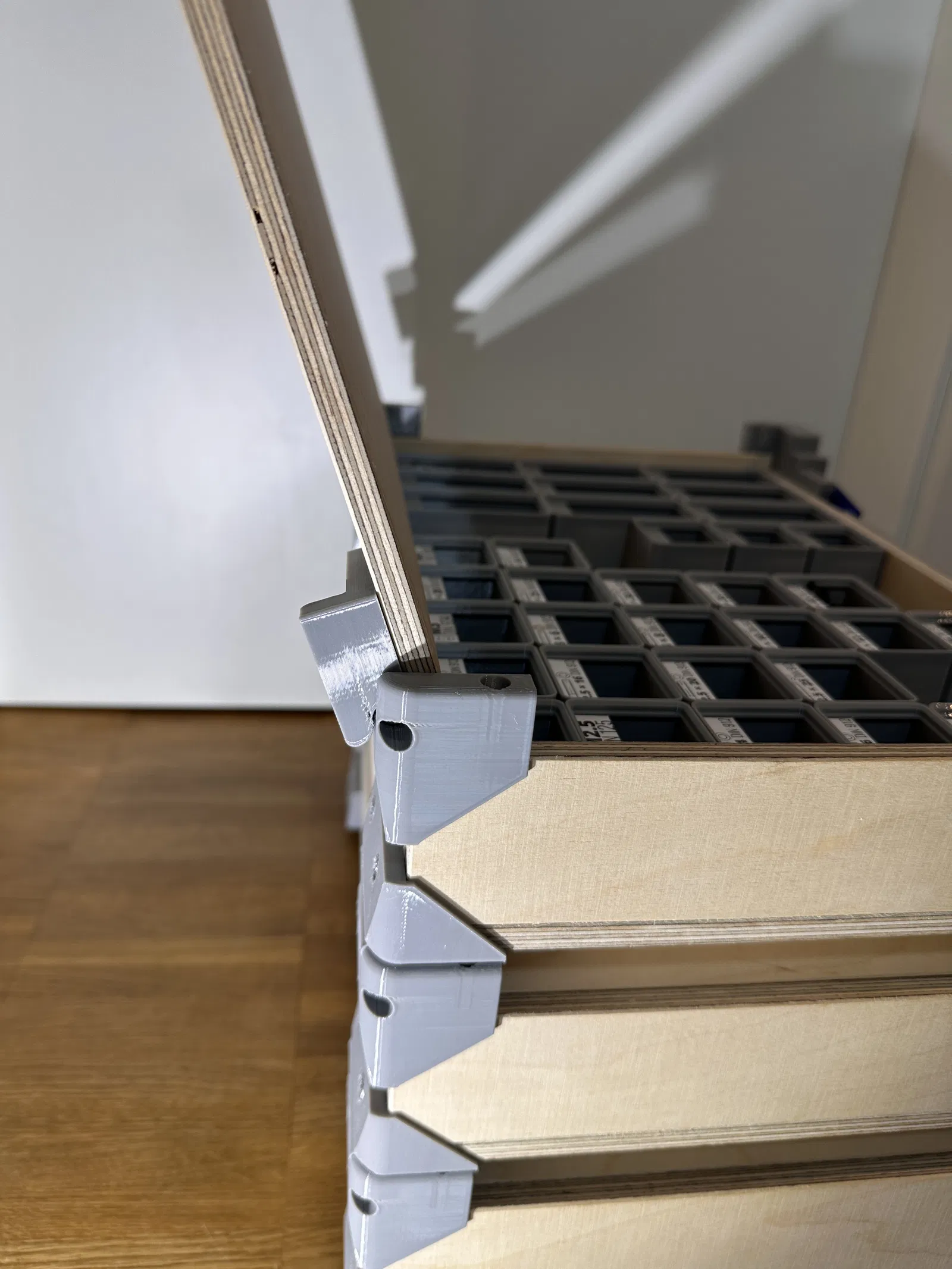 Vì thế, tôi tự phát triển thiết kế của riêng mình. Mục tiêu là kết nối trực tiếp Gridfinity và Euroboxes, giữ cho các bộ phận in 3D đơn giản nhất có thể và kết hợp với vật liệu tiêu chuẩn từ cửa hàng kim khí. Điều này giúp giảm chi phí và thời gian in, đồng thời linh kiện thay thế luôn dễ tìm. Tôi cố tình tránh dùng bản lề mua sẵn để đảm bảo tính sẵn có lâu dài trên toàn cầu. Tôi thấy bản lề in hoàn toàn không bền về lâu dài, nên tôi sử dụng ốc vít tiêu chuẩn làm trục. Sau khoảng mười lần chỉnh sửa lớn nhỏ, tôi đã hài lòng để chia sẻ dự án này tại đây.