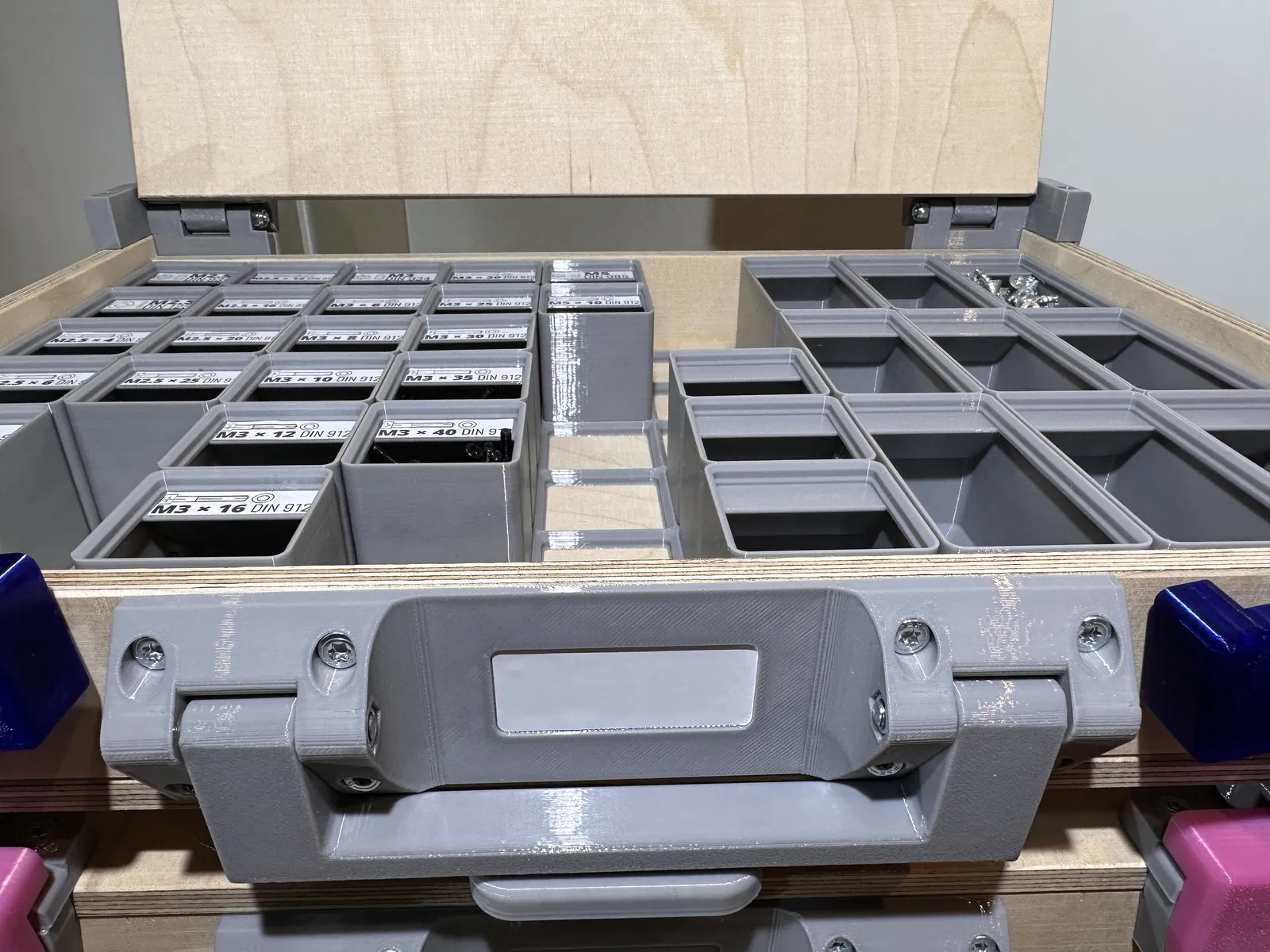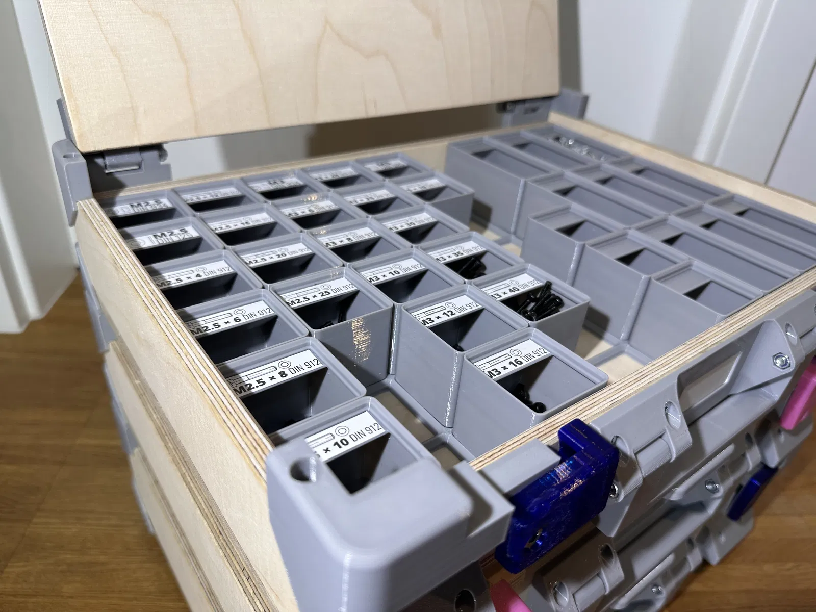 Tôi từng tìm kiếm một giải pháp sắp xếp linh kiện nhỏ thật sự hiệu quả. Tôi đã sử dụng Gridfinity khá lâu, cũng như Euroboxes, vì chúng rất hữu ích trong công việc hằng ngày. Tôi đã xem qua vài giải pháp chuyển đổi giữa Gridfinity và Makpac hay Sortimo nhưng chúng thường không tận dụng tốt không gian và chi phí lại khá cao. Các loại hộp in 3D hoàn toàn thường khá nhỏ, tốn nhiều thời gian in và nguyên liệu. Hộp của Alex Chappell đã tạo cảm hứng cho tôi rất nhiều: Tôi thích ý tưởng đó, nhưng nó lại không tương thích với Gridfinity và vài chi tiết thiết kế chưa đúng ý tôi.