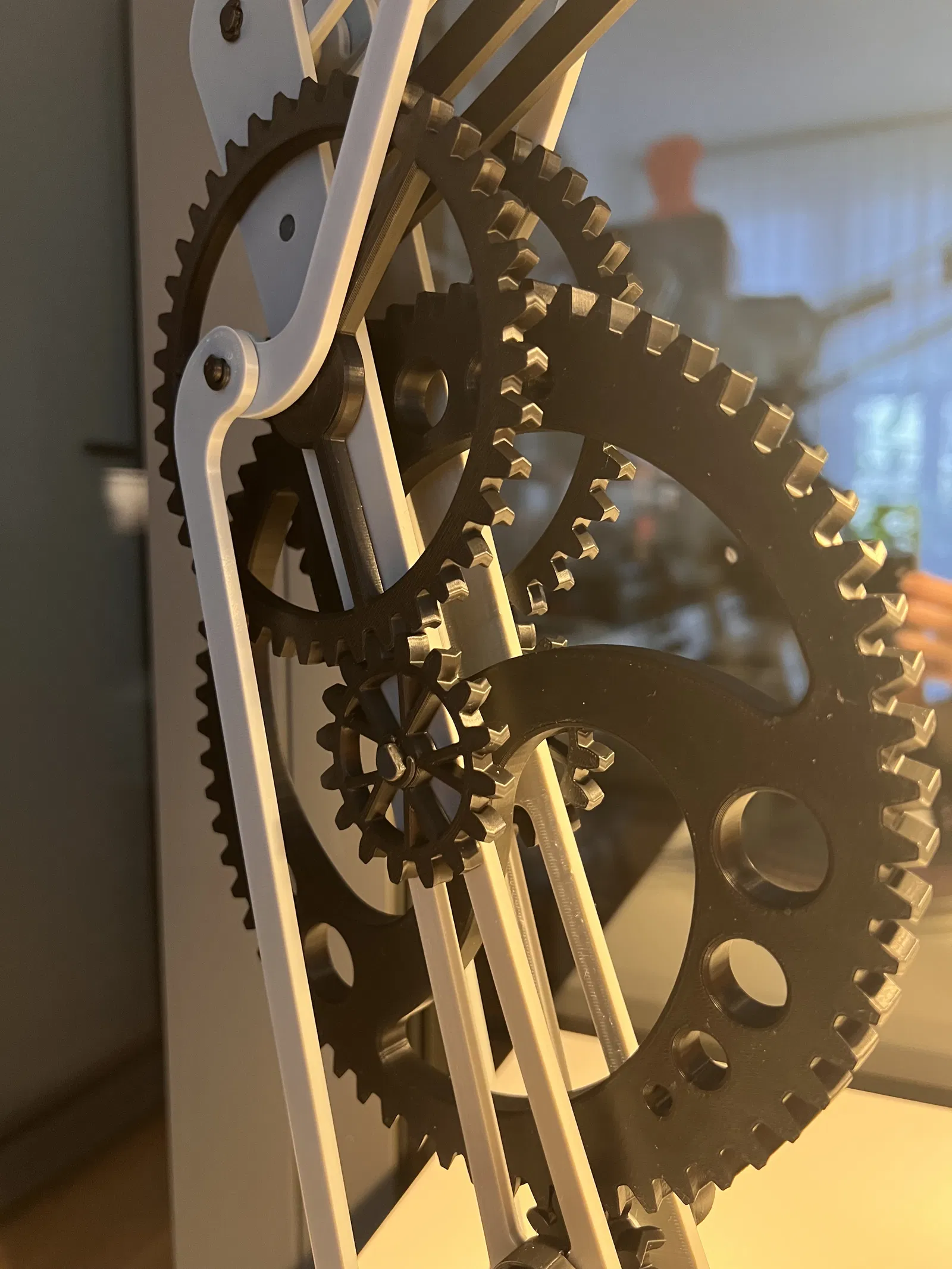 Căn chỉnh bánh răng 9t với bánh răng 64t và lỗ 6mm ở cuối các cánh tay chính. Đẩy trục qua và căn giữa. Lắp các bánh cóc (ratchet) và núm vặn (knob). Nó phải đủ khít để không bị tuột.
