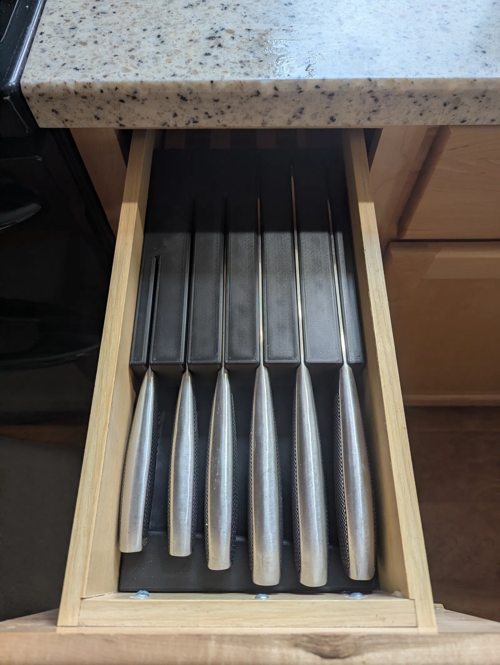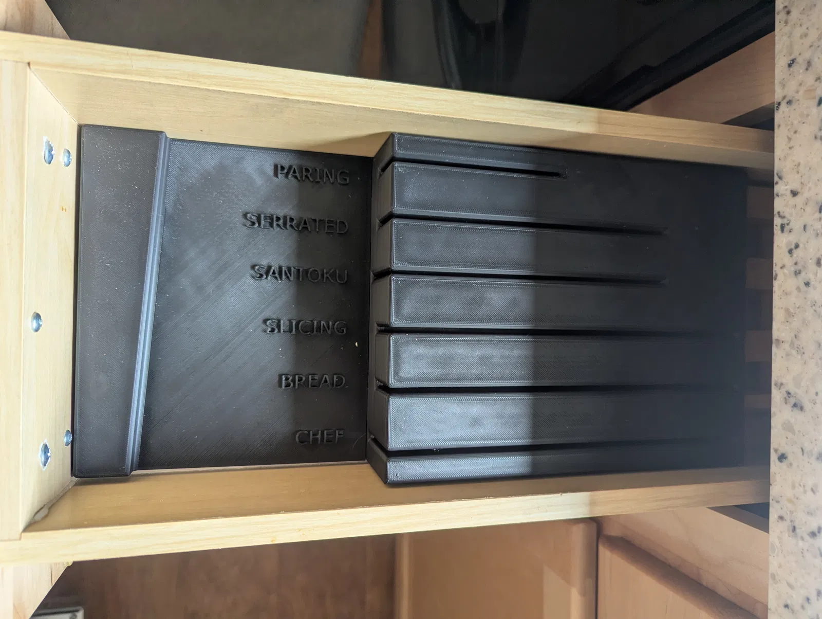 Khay được in 3D với kích thước vừa khít, phân chia từng ngăn cho các loại dao cụ thể như dao Chef 8 inch, dao thái lát, dao cắt bánh mì, dao Santoku, dao có răng cưa và dao gọt trái cây. Việc bố trí theo ngăn cố định giúp bạn lấy đúng loại dao cần dùng chỉ trong một nốt nhạc, tránh va chạm không đáng có giữa các lưỡi dao sắc bén. Đây là phụ kiện 3D cực kỳ thực tế cho bất kỳ căn bếp gia đình nào, giúp tối ưu hóa không gian lưu trữ một cách khoa học.