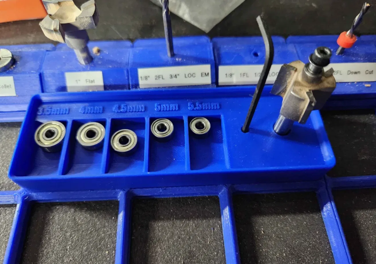 Cái đế này dùng để giữ mũi phay rabbeting cán 1/4" cùng với các vòng bi đi kèm và chìa lục giác. Nó có các khe cắm vừa khít cho các cỡ vòng bi: 3.5mm, 4mm, 4.5mm, 5mm và 5.5mm. Mình thiết kế cái này dựa trên bộ mũi phay rabbeting 49436 của Amana Tool, nhưng bạn cũng có thể dùng nó cho các bộ mũi khác tương tự nha.