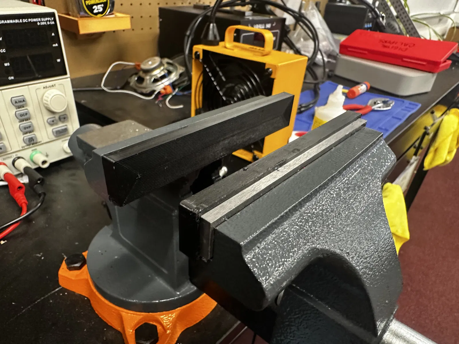 Đây là mẫu ốp má kìm nhựa dùng cho ê tô Vevor 4 1/2 inch. Kích thước bên trong bao gồm: chiều dài 115mm, chiều cao 15mm, độ sâu 2mm và dung sai 0.07. Các lỗ nam châm có đường kính 10mm và độ sâu 1.78mm. Mình đã in mẫu này bằng nhựa PETG với 33 đường biên (perimeters) để đảm bảo độ cứng cáp và đặc hoàn toàn. Sản phẩm này được thiết kế để lắp đè lên má kìm kim loại, giúp bảo vệ vật liệu khi kẹp.