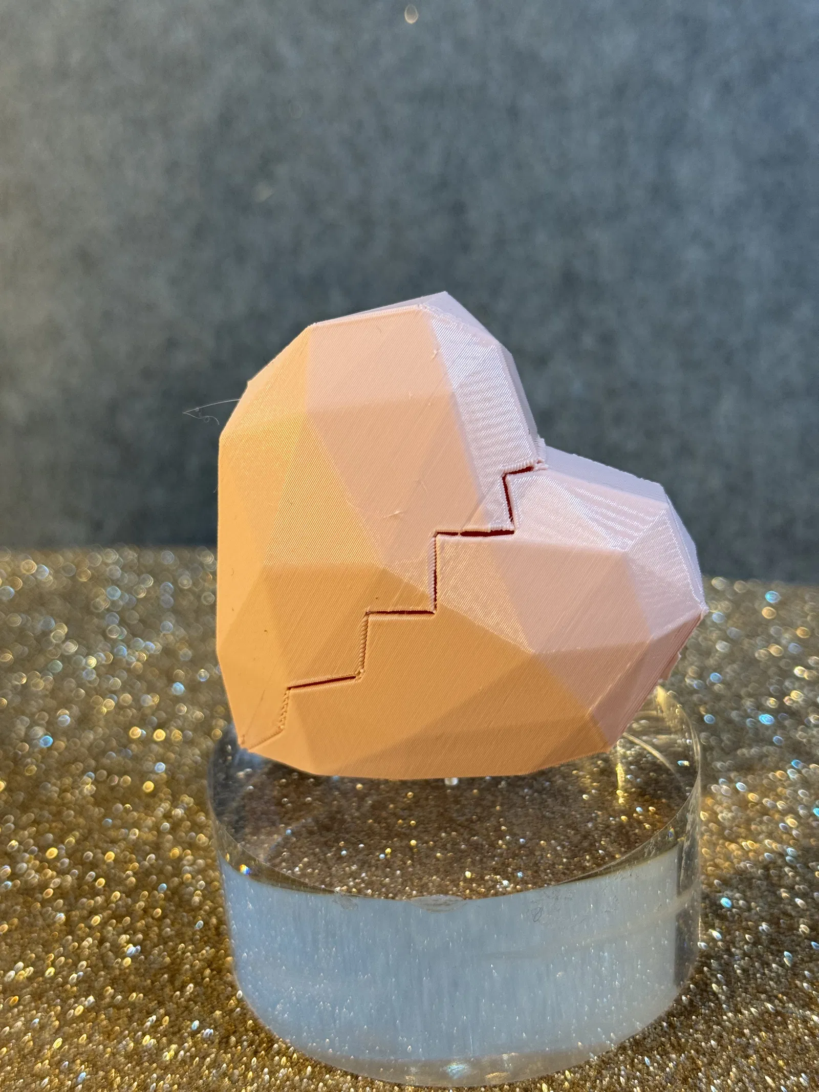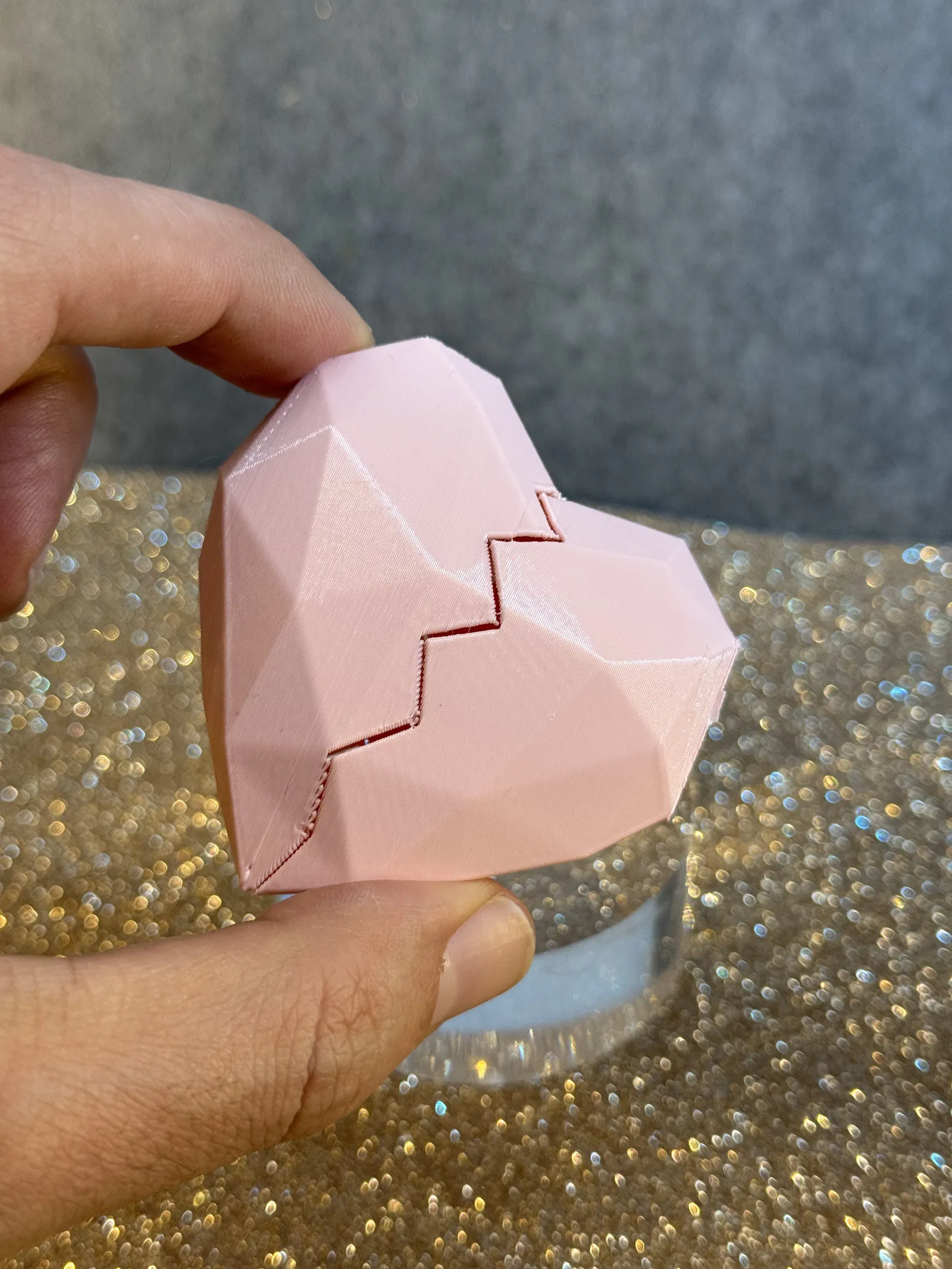 Thiết kế của mẫu này có hình trái tim đa diện theo phong cách low-poly, tạo ra những hiệu ứng ánh sáng bắt mắt trên bề mặt và làm nổi bật các đường nét đặc trưng của in 3D. Ở chính giữa mô hình có một đường chia cắt hình zigzag, được thiết kế để khớp nối hai nửa trái tim lại với nhau.