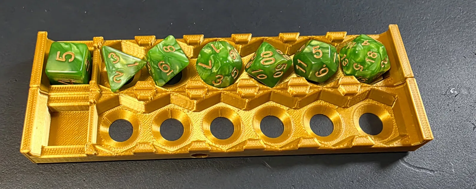 Khay được thiết kế với các khoang chứa chuyên biệt, vừa vặn cho bộ xúc xắc tiêu chuẩn, giúp bạn dễ dàng lấy ra hoặc cất vào một cách nhanh chóng. Dù bạn là một người chơi chuyên nghiệp hay chỉ là người mới bắt đầu sưu tầm các bộ dice đẹp mắt, món phụ kiện 3D này chắc chắn sẽ làm hài lòng bạn nhờ tính hữu dụng cao và vẻ ngoài chỉn chu, hiện đại.