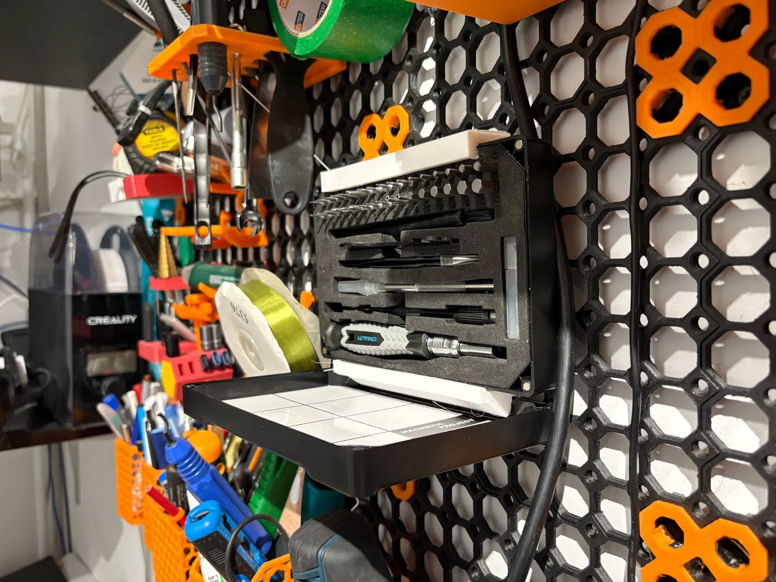 Dự án này mang đến một giải pháp gọn gàng và chắc chắn để treo các khay đựng dụng cụ bằng nhựa lên tường. Thay vì dùng kệ thông thường, các giá đỡ này được thiết kế để "ôm" khay, giúp bạn lấy dụng cụ dễ dàng mà vẫn tiết kiệm diện tích bàn làm việc.