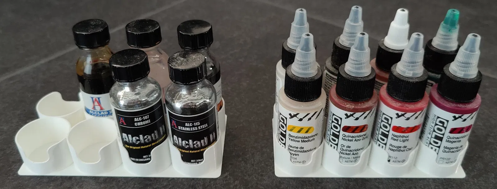 Các mô hình của Notcolin rất phù hợp để lưu trữ bộ sưu tập sơn của con trai tôi, nhưng ít phù hợp hơn cho các chai của Golden và Alclad 2 do đường kính khác nhau. Bằng cách điều chỉnh đường kính, có rất ít khoảng trống giữa các chai và vành, và bạn có thể dễ dàng lấy ra một giá đầy chai từ, ví dụ, một ngăn kéo sâu hoặc thùng.