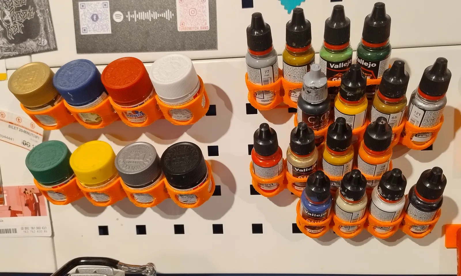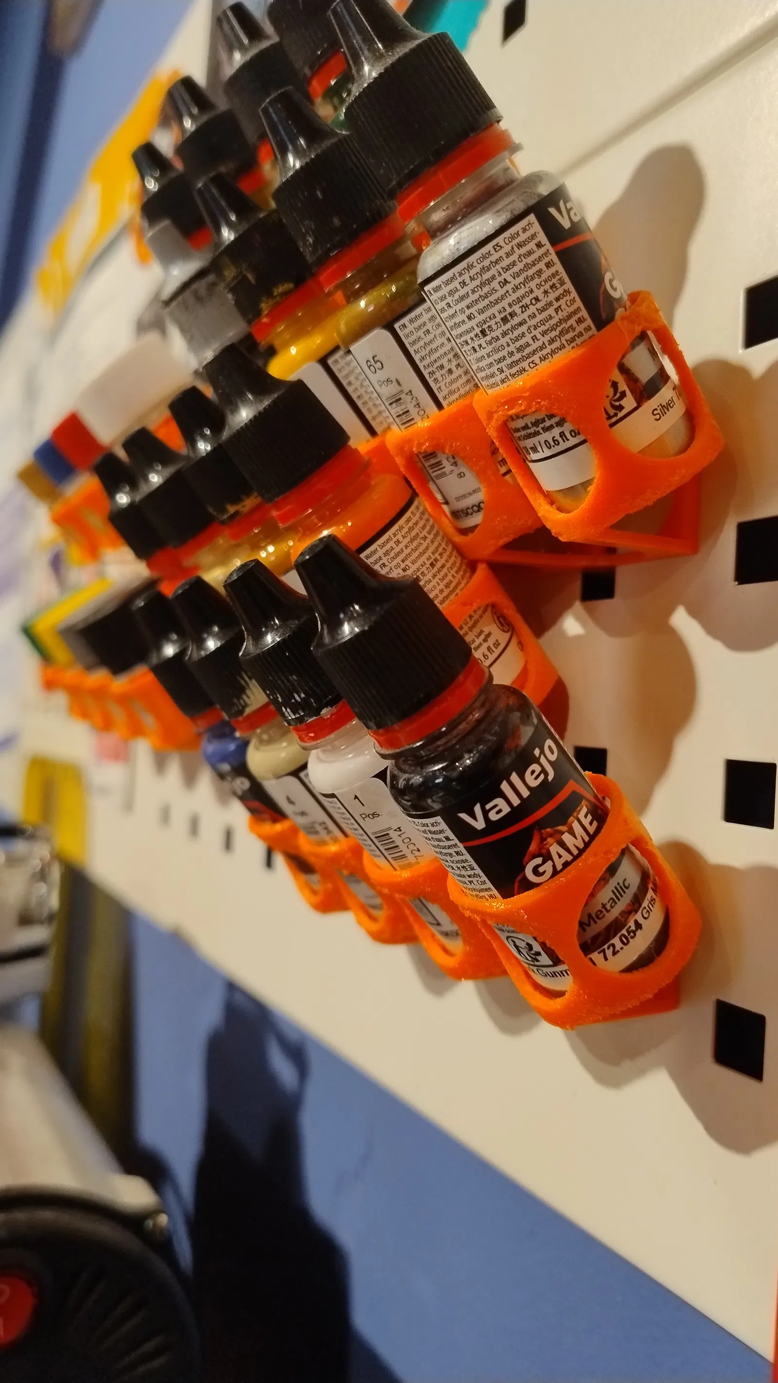 Giá đỡ sơn cho các loại lọ Vallejo/Tamiya. Phiên bản dành cho bảng đục lỗ (perfboard) với lỗ 10x10mm, khoảng cách 36mm và bảng IKEA Skadis (xem lưu ý bên dưới!). Mình in mẫu này bằng nhựa PETG màu cam.