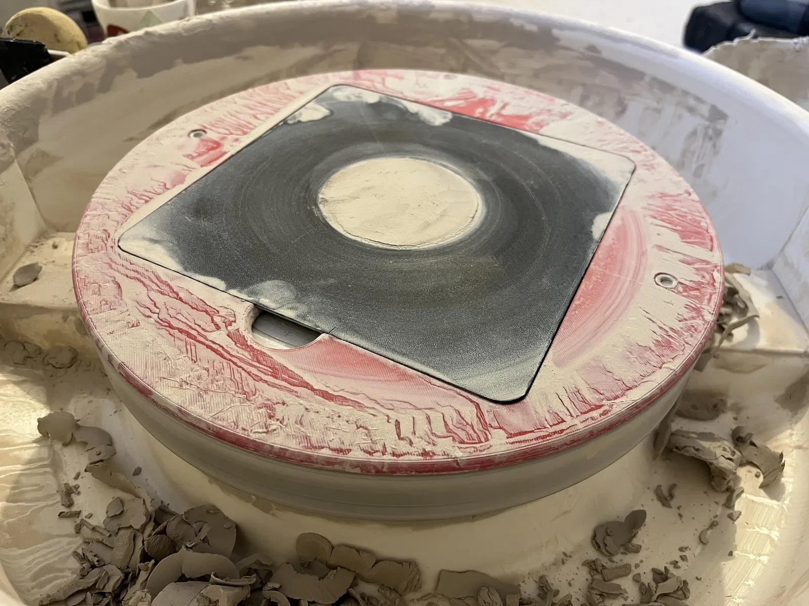 Hệ thống bàn xoay (bat system) đơn giản dành cho Shimpo Whisper T, nhưng cũng vừa vặn với các loại máy xoay gốm khác sử dụng ốc M6 với khoảng cách tâm lỗ (C-C) từ 245-265mm nhờ thiết kế lỗ khoét rãnh. Các cạnh được bo tròn để tránh làm trầy xước tay khi sử dụng, đồng thời có phần hở để dễ dàng tháo bàn xoay ra.