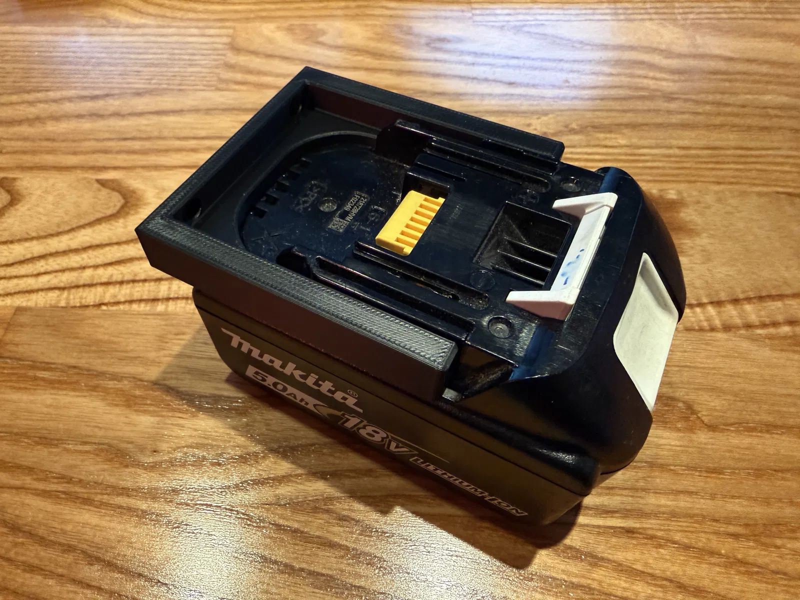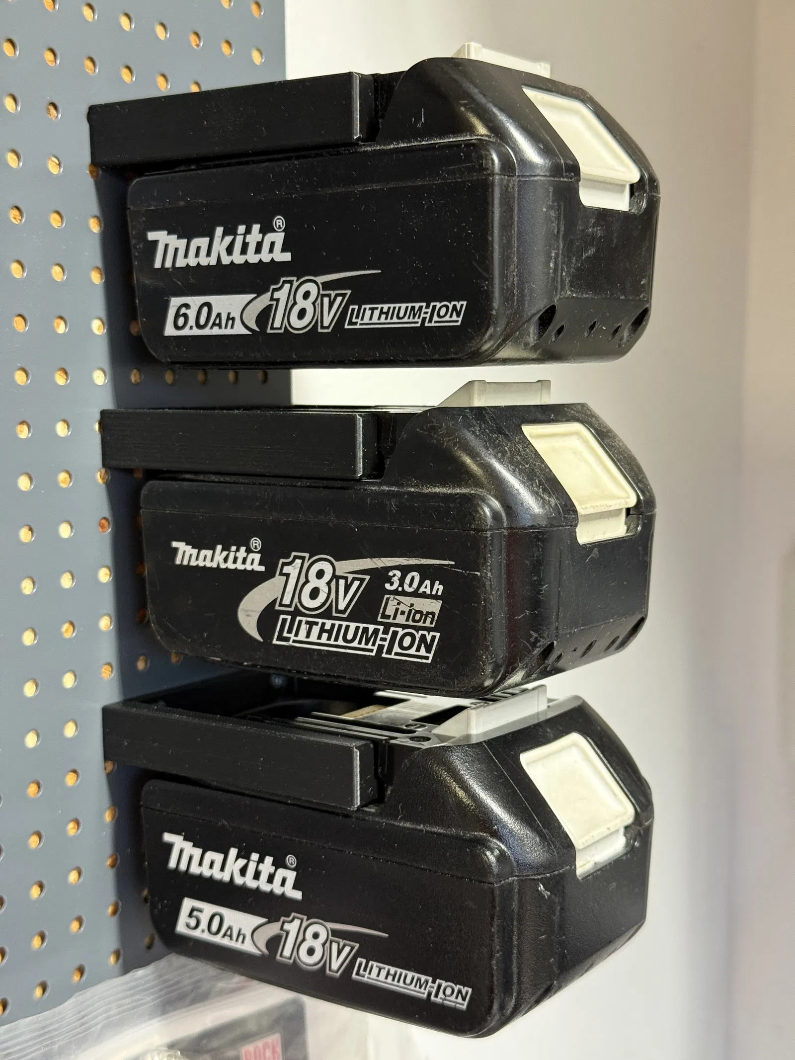 Giá treo pin Makita 18V. Thiết kế dạng ngạnh ngang giúp tiết kiệm không gian. Chỉ cần trượt pin về phía bạn là lấy ra được. Phù hợp cho bảng treo dụng cụ 12x12mm hoặc gắn trực tiếp lên tường phẳng. Có hai phiên bản với lỗ bắt vít 3.5mm và 5mm. Bạn nên dùng loại 5mm để bắt ren vào bảng lỗ 12x12. Đã in thử bằng chất liệu PETG.