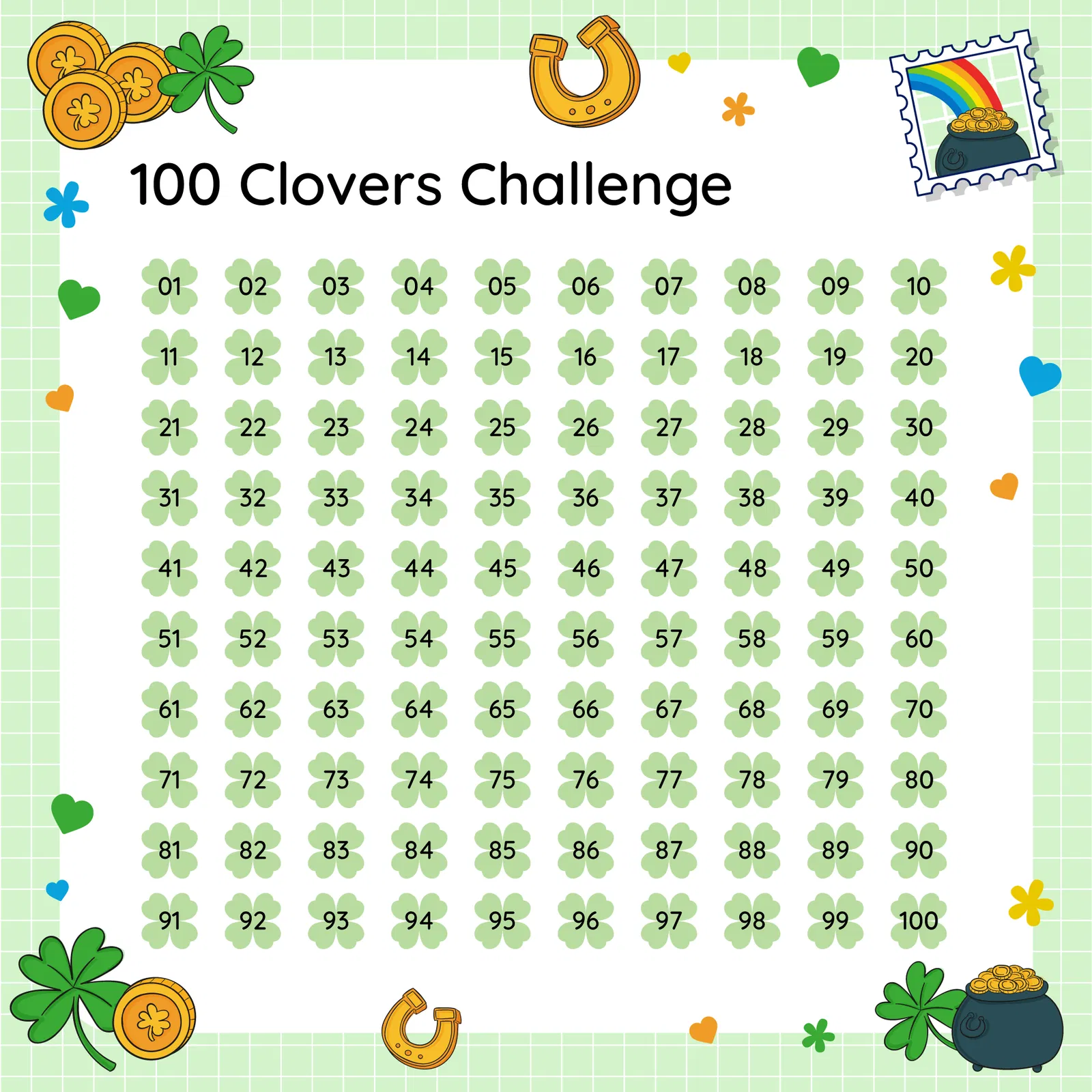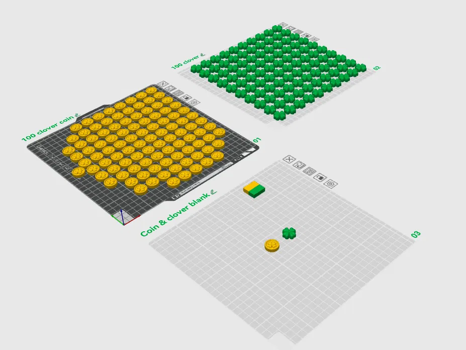 Chuẩn bị cho lễ St. Patrick với bộ 100 cỏ bốn lá và 100 đồng xu vàng đánh số cực kỳ tiện lợi. File thiết kế đi kèm giúp bạn in ấn dễ dàng cho các trò chơi, sự kiện hoặc quà tặng may mắn. Tải ngay để bắt đầu cuộc săn kho báu của riêng bạn!