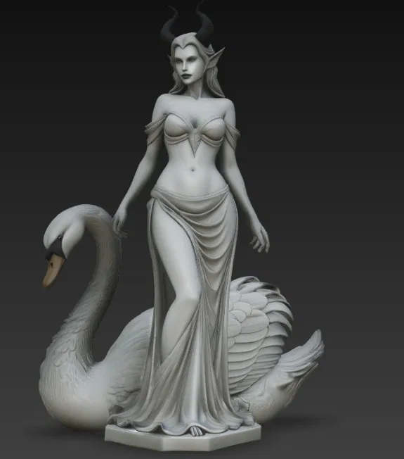 Từng đường nét trên bức tượng đều được chăm chút tỉ mỉ, từ tà váy dài thướt tha ôm sát cơ thể cho đến những sợi lông vũ được điêu khắc tinh tế trên mình thiên nga. Phần sừng quỷ trên đầu nhân vật tạo nên sự đối lập đầy thú vị với nét mặt sắc sảo, gợi lên cảm giác quyền lực và bí ẩn. Đây không chỉ là một mô hình đơn thuần, mà là một tác phẩm điêu khắc kỹ thuật số chứa đựng nhiều tầng nghĩa, rất phù hợp để làm quà tặng hoặc trang trí trong các không gian làm việc sáng tạo.