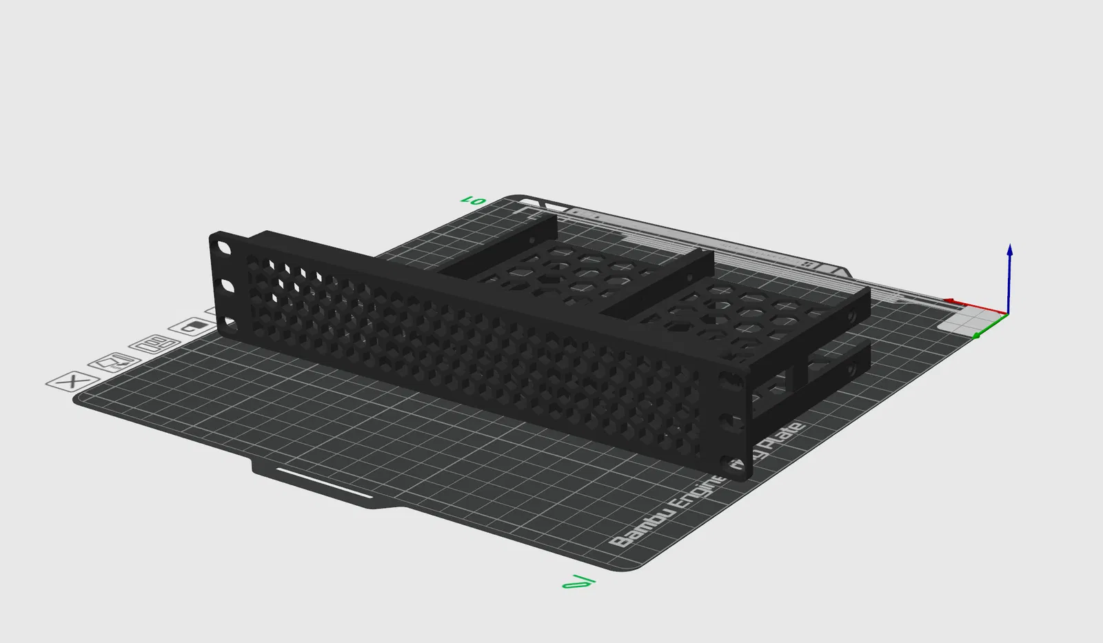 Mình cần một cách để gắn 4 ổ cứng 2.5 inch vào tủ rack 10 inch của mình. Khoảng trống phía trên đã bị chiếm bởi một chiếc Lenovo M710q, máy đó có ổ M.2 với cổng kết nối SATA nằm ở mặt đáy nên mình phải chừa một khoảng trống ở phía bên trái của bản in để gắn vừa nó. Mình đã in bằng nhựa PETG để tăng khả năng chịu nhiệt.