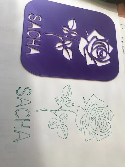 Pochoir được thiết kế dựa trên hình vẽ hoa hồng. Sản phẩm này giúp bạn vẽ hình bông hoa kèm theo tên Sacha ở phía dưới.