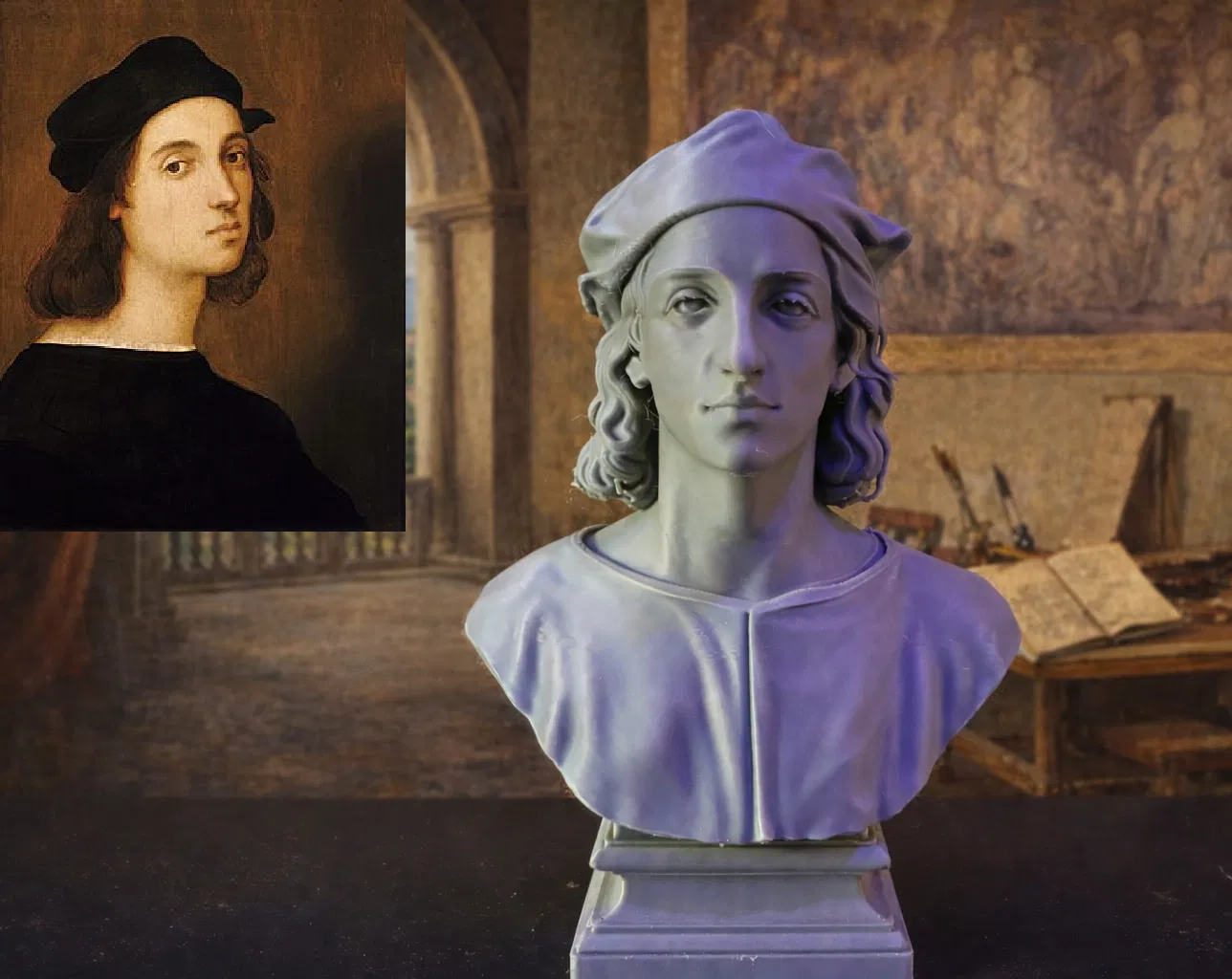 Bức tượng này khắc họa Raphael, hay Raffaello Sanzio da Urbino, một trong những họa sĩ lừng danh nhất của thời kỳ Phục hưng Ý. Tác phẩm điêu khắc này nắm bắt những đường nét hài hòa và dễ nhận biết gắn liền với các bức chân dung lịch sử của ông, đặc biệt là những hình ảnh được lấy cảm hứng từ chính các bức tự họa của chính nghệ sĩ. Bức tượng này dựa trên hình ảnh phổ biến nhất về Raphael, vốn thường xuyên xuất hiện trong các sách lịch sử nghệ thuật và các tài liệu tham khảo.