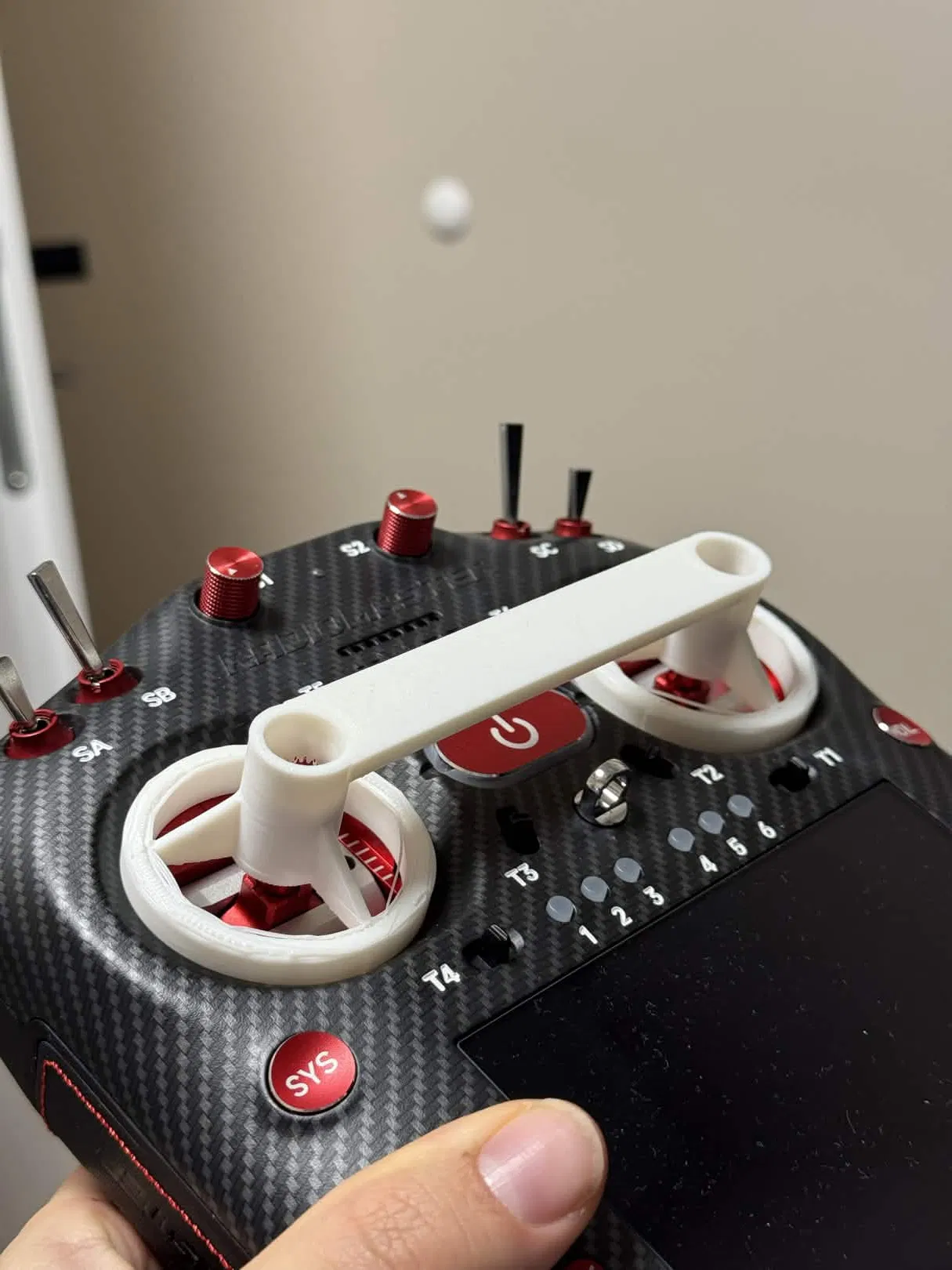 Phụ kiện này có thiết kế dạng thanh ngang đơn giản nhưng vô cùng hiệu quả, nó ôm trọn lấy phần cụm gimbal của tay cầm Radiomaster TX16S. Khi lắp vào, nó sẽ cố định cần điều khiển ở vị trí trung tâm, ngăn chặn tình trạng cần gạt bị rung lắc, va đập hoặc vô tình bị gãy khi anh em bỏ tay cầm vào balo hay túi đựng máy ảnh thông thường. Đây là một giải pháp cực kỳ gọn nhẹ và tiết kiệm cho những anh em hay di chuyển, đi quay phim hoặc đi bay ở xa mà không muốn mang theo vali chuyên dụng.