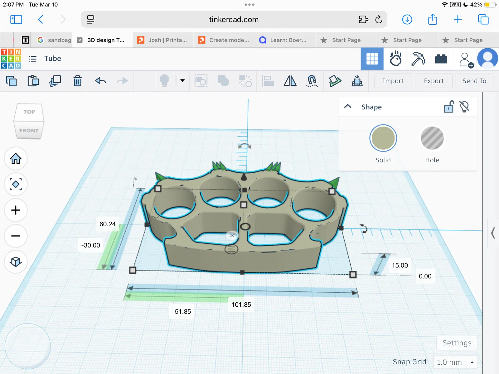 Đây là mô hình 3D của một chiếc tay đấm thép (brass knuckles) được thiết kế bằng phần mềm Tinkercad. Với hình dáng đặc trưng gồm bốn lỗ xỏ ngón và phần khung chắc chắn, sản phẩm này thường được những người đam mê sưu tầm đồ dùng mô phỏng hoặc làm phụ kiện trang trí, đạo cụ cho các buổi chụp ảnh nghệ thuật hoặc phim ảnh. Thiết kế này mang phong cách cơ bản, sắc sảo với các góc cạnh được bo tròn hợp lý để đảm bảo thẩm mỹ khi in ra thành phẩm.