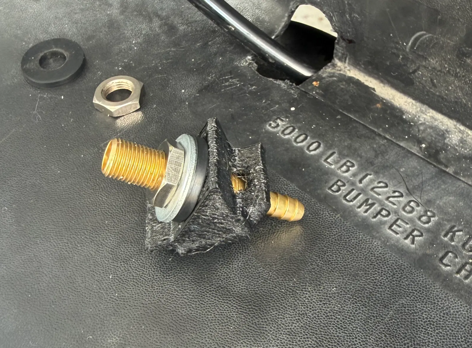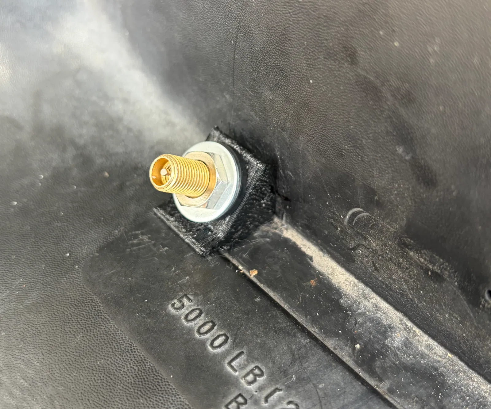 Giải pháp lắp đặt van bơm hơi cho hệ thống treo xe Ram 1500 đời 2015 mà không cần khoan lỗ lên khung biển số. Sản phẩm có thiết kế khớp nối tiện lợi, giúp giữ chặt van và cố định các góc biển số một cách chắc chắn và thẩm mỹ.