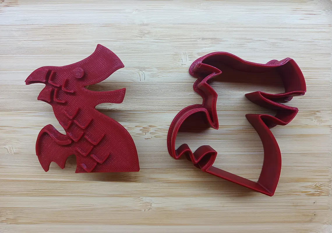 Khuôn cắt bánh quy hai phần được mô phỏng theo hình dáng meeple dễ thương từ trò chơi board game Flamecraft. Vì hai phần này không lồng vào nhau như các loại khuôn thông thường, bạn cần đặt chúng tách rời trên bàn in. Mình có thêm một phần tay cầm nhỏ để bạn có thể dùng keo siêu dính gắn vào mặt sau của khuôn, giúp việc thao tác dễ dàng hơn.
