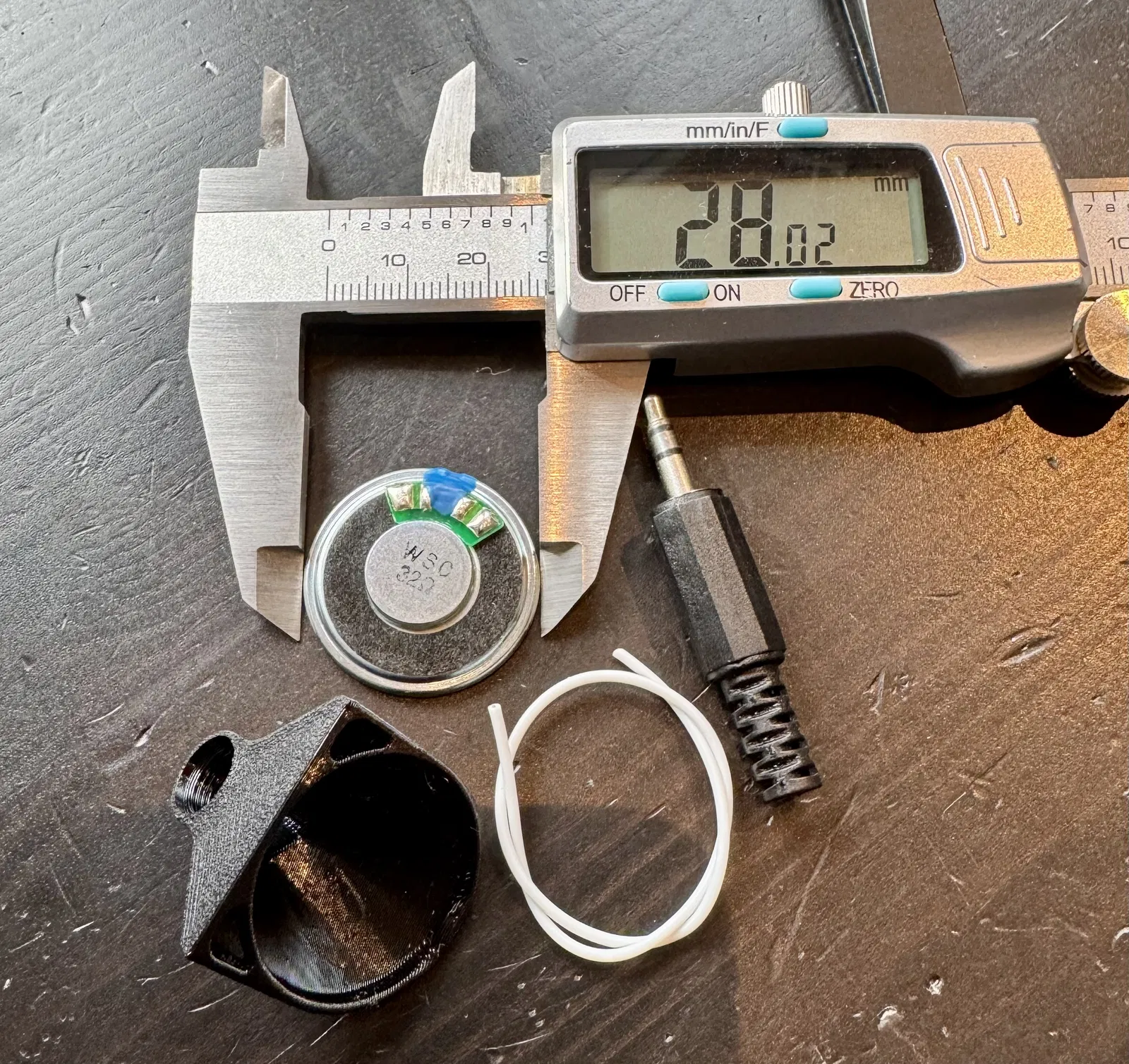 Linh kiện cần thiết: 1 x Loa 28mm 32Ohm mua trên Aliexpress - giá chỉ vài đô la... 1 x Jack cắm Stereo 3.5mm mua trên Aliexpress - vài đô la cho một túi 5 cái... 10cm dây điện mảnh. Mình dùng loại 28AWG