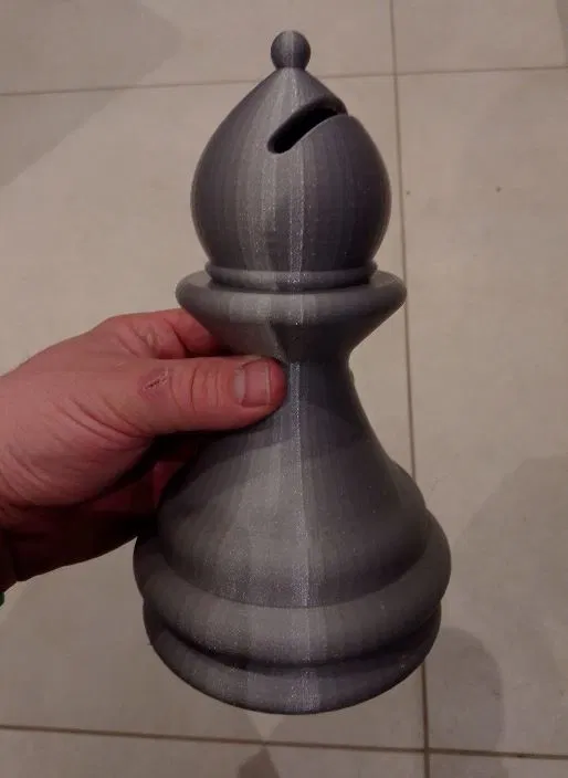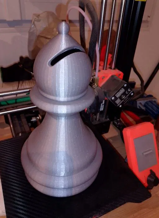 Món quà thú vị cho những người yêu thích cờ vua. Mẫu ống heo hình quân Tượng (Bishop) được in trên máy mK3s với chiều cao 210mm. Lưu ý sử dụng support thủ công khi in để đảm bảo phần nắp vừa vặn.