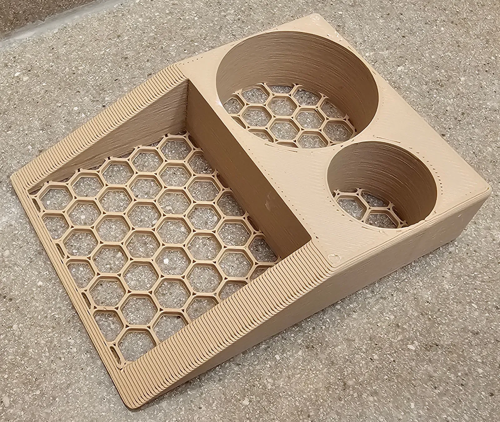 Khay đựng nhỏ gọn dành cho dung dịch ngâm/rửa kính, thuốc nhỏ mắt và hộp đựng kính áp tròng thông thường. Thiết kế phần đáy có cấu trúc tổ ong giúp thoát nước hiệu quả. Mình đã in mẫu này bằng nhựa PLA, sử dụng đầu phun 0.6mm, chiều cao lớp in 0.3mm và mật độ lấp đầy (infill) là 10%.