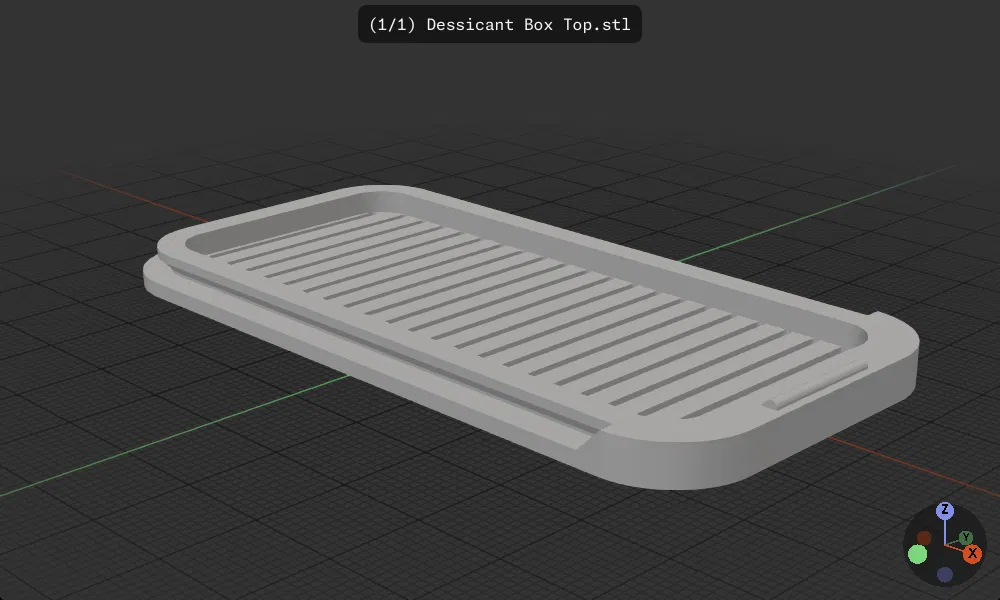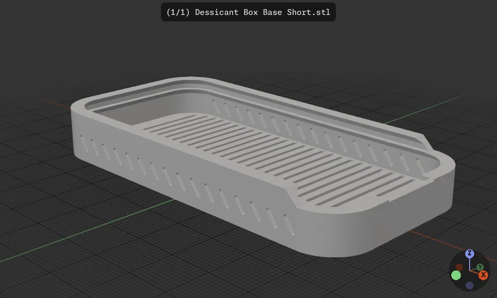 Thiết kế của hộp tập trung vào hiệu suất với các khe hở rộng 1mm, đảm bảo không khí lưu thông tối đa để hạt hút ẩm có thể phát huy hiệu quả tốt nhất. Bạn có thể dễ dàng in mô hình này với hầu hết các loại máy in 3D phổ biến hiện nay. Sản phẩm bao gồm phần đế và nắp trượt, được tính toán kích thước kỹ lưỡng để khớp nối hoàn hảo, mang lại vẻ ngoài gọn gàng và thẩm mỹ cao cho không gian làm việc của bạn.