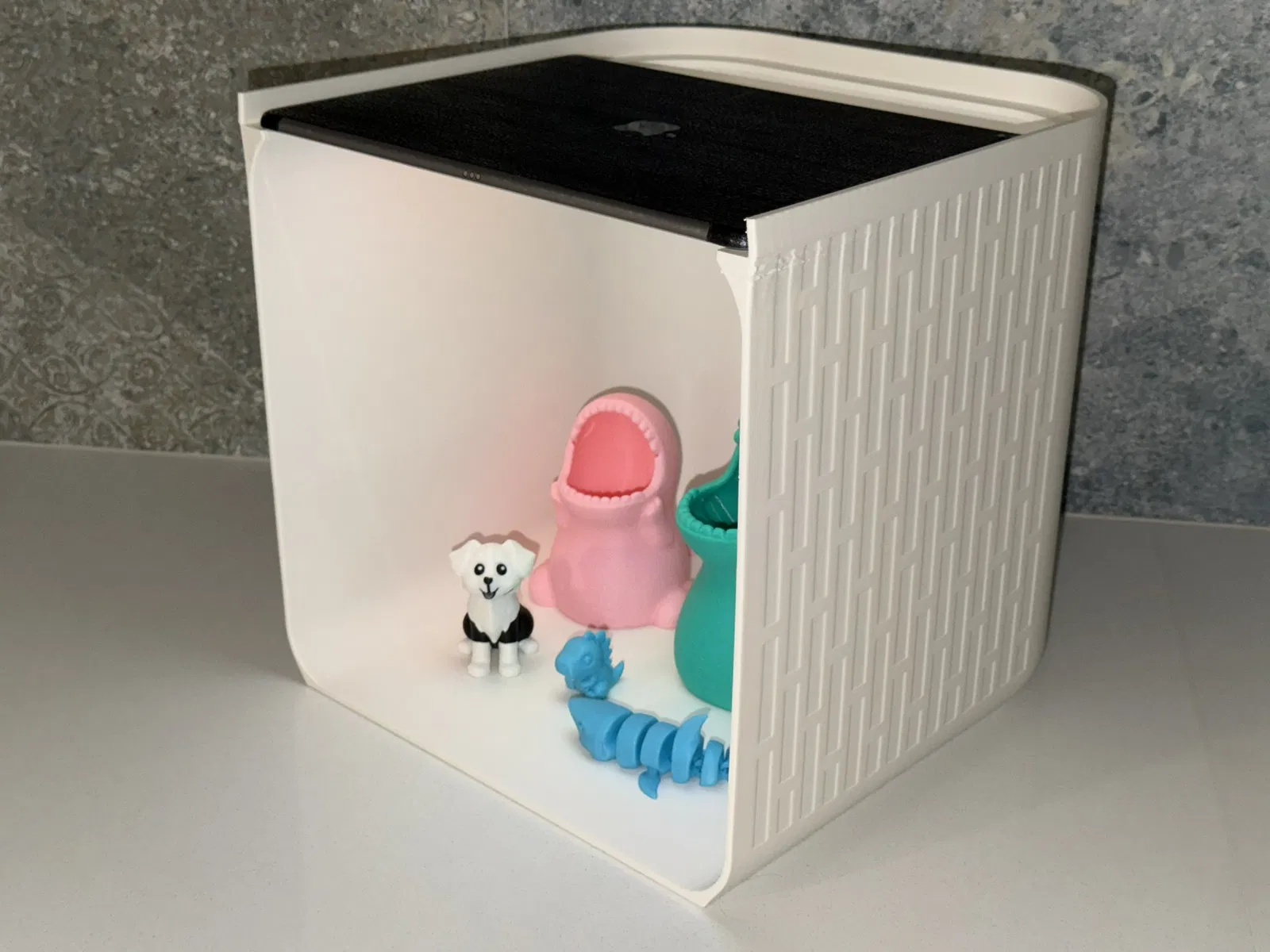 Hộp chụp ảnh thông minh, hoàn toàn tùy biến với OpenSCAD. Thiết kế tối ưu cho máy in 3D, không cần support, giúp chụp sản phẩm 2D chuyên nghiệp với ánh sáng đều.