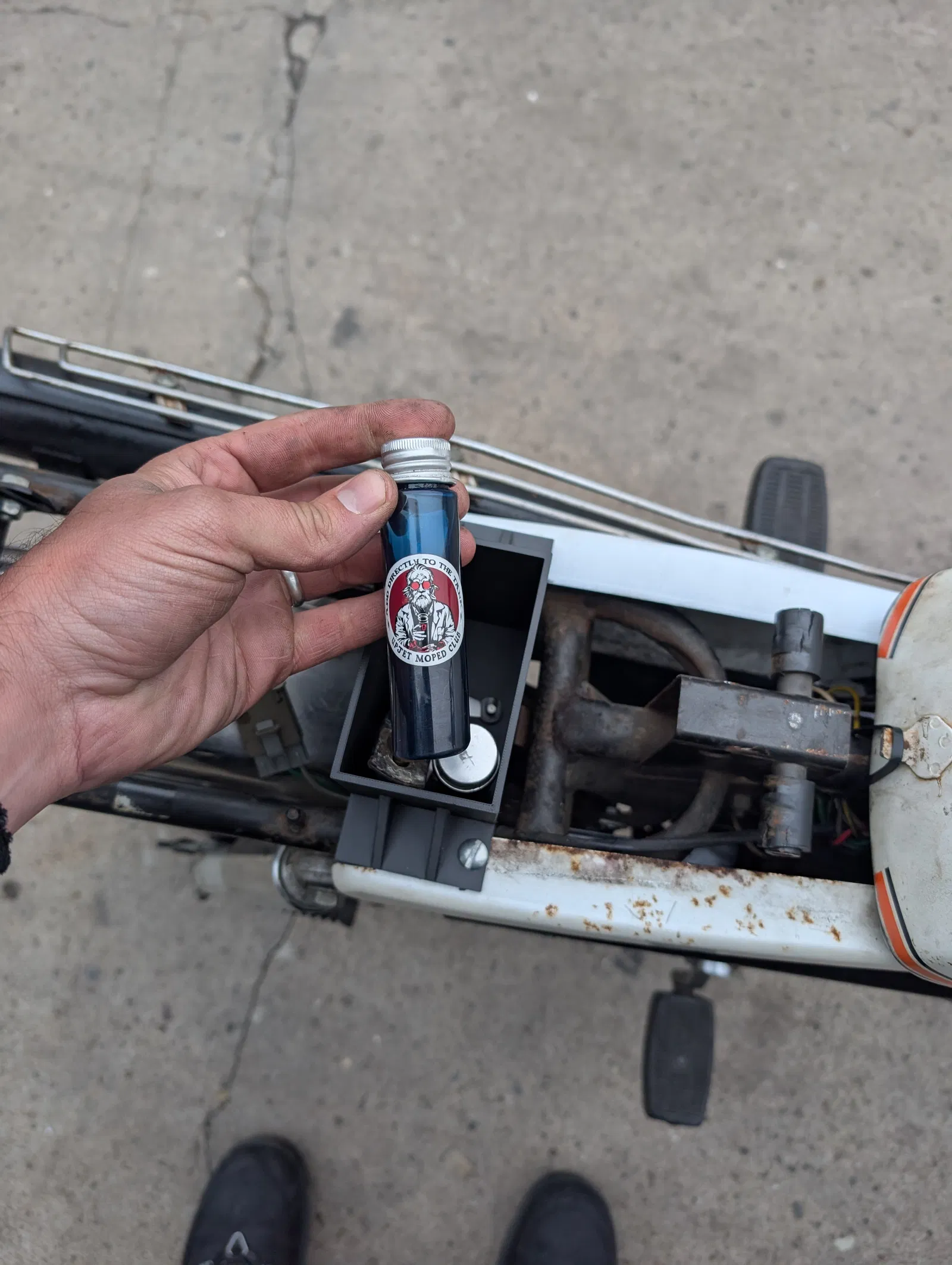 Ngăn chứa đồ này tận dụng không gian dưới yên xe lật lên của dòng Peugeot TSM. Bằng cách sử dụng các điểm bắt ốc có sẵn của ốp hông, phụ kiện này cung cấp thêm không gian để đựng vài chai nhớt, các loại ốc vít linh tinh cũng như bugi dự phòng.