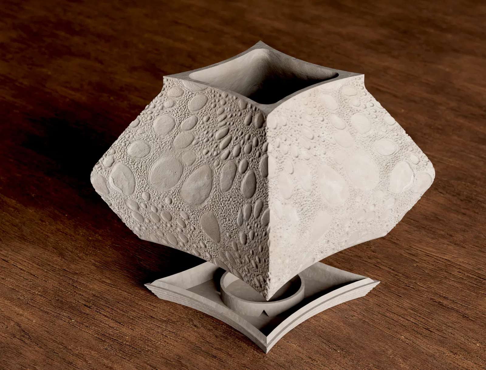 Chiếc chậu cây trong nhà này là sự kết hợp giữa kỹ năng thiết kế và tạo vân bề mặt của mình trên Blender. Điểm nổi bật nhất chính là lớp vân bề mặt cực kỳ chi tiết, nhờ vào kỹ thuật displacement trên Blender và chất lượng lưới mô hình cao cấp.