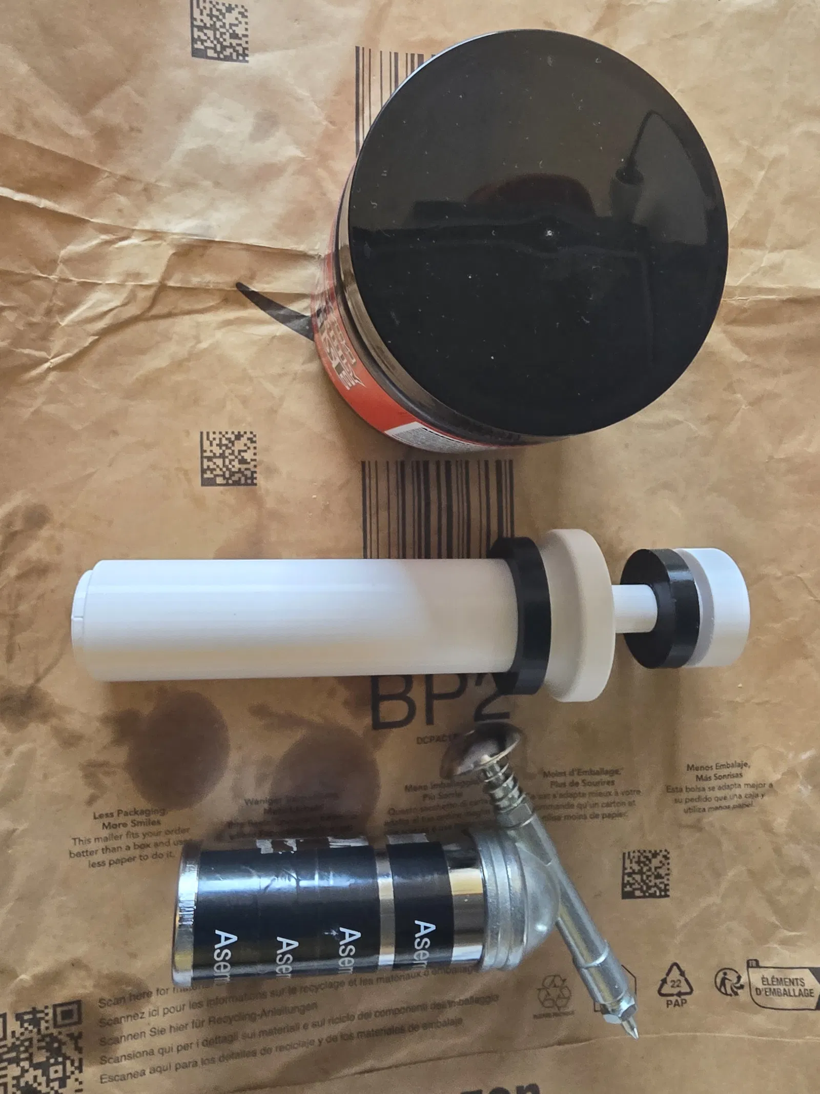 Đây là thiết kế của mình giúp việc châm mỡ vào súng bắn mỡ mini trở nên gọn gàng và bớt bừa bộn hơn từ hộp mỡ. Bạn chỉ cần khoảng 3 lần "bơm" là đầy súng. Hãy sử dụng vòng gạt (wiper rings) để kiểm soát lượng mỡ dư thừa nhé.